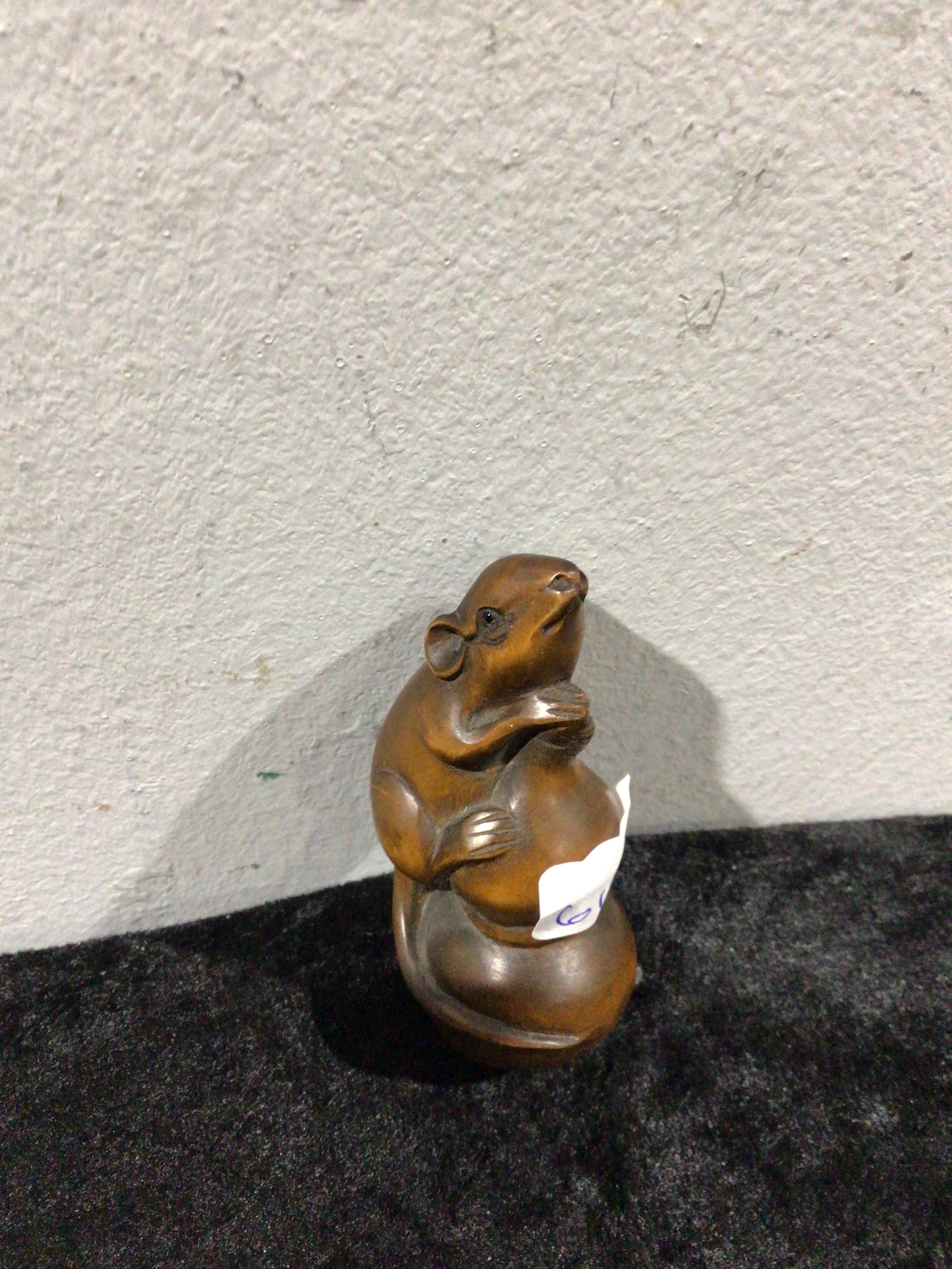 A carved wood netsukedepicting a rat. The rat grasps a rounded object, possibly a gourd or sack. The carving exhibits a rich, polished, reddish-brown patina. The base features two characteristic himotoshi holes. A small white sticker with blue alphanumeric characters, appearing to be an inventory or auction tag , is affixed to the rounded object.
