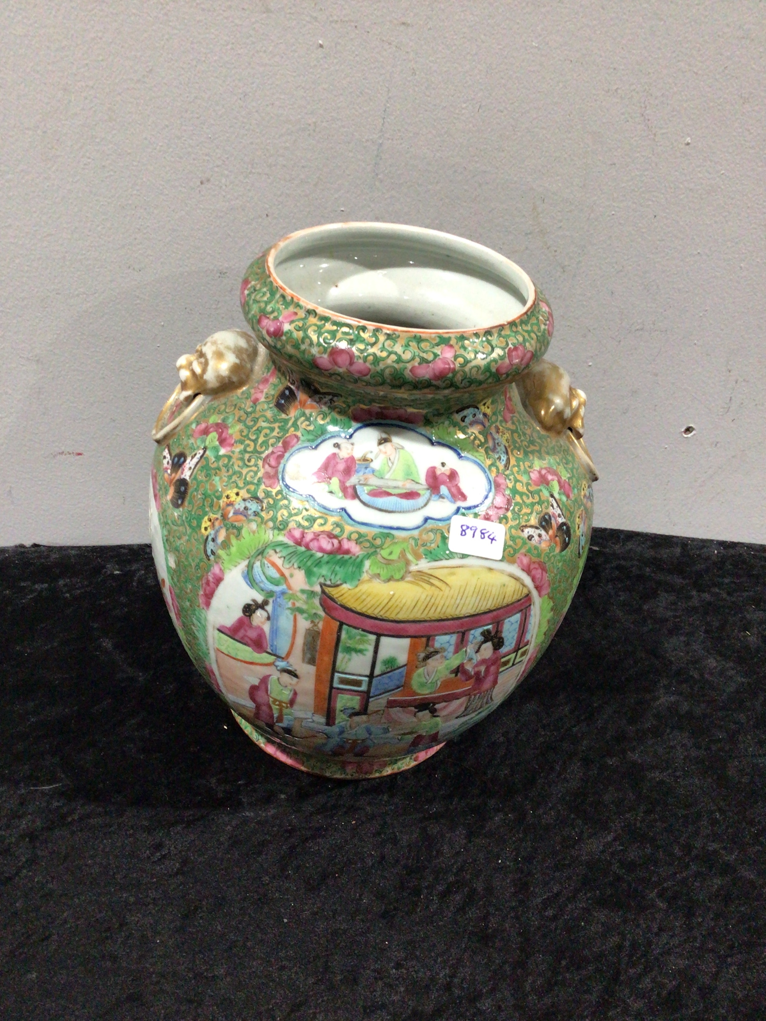 A Chinese Famille Rose Medallion bulbous pot or planter. The vessel features a wide mouth with a flaring rim and two gilded, zoomorphic handles (possibly foo dogs) on the shoulders. The body is extensively decorated with a dense, intricate green ground adorned with stylized floral scrolls and butterflies, interspersed with several shaped cartouches. These cartouches depict detailed figural scenes in traditional Chinese indoor and outdoor settings, utilizing a polychrome enamel palette including pink, green, blue, yellow, and red. The interior of the mouth is glazed white, and the unglazed foot rim reveals a fine, light-colored ceramic body. A white sticker with the numbers “8784” in red is adhered to the body.