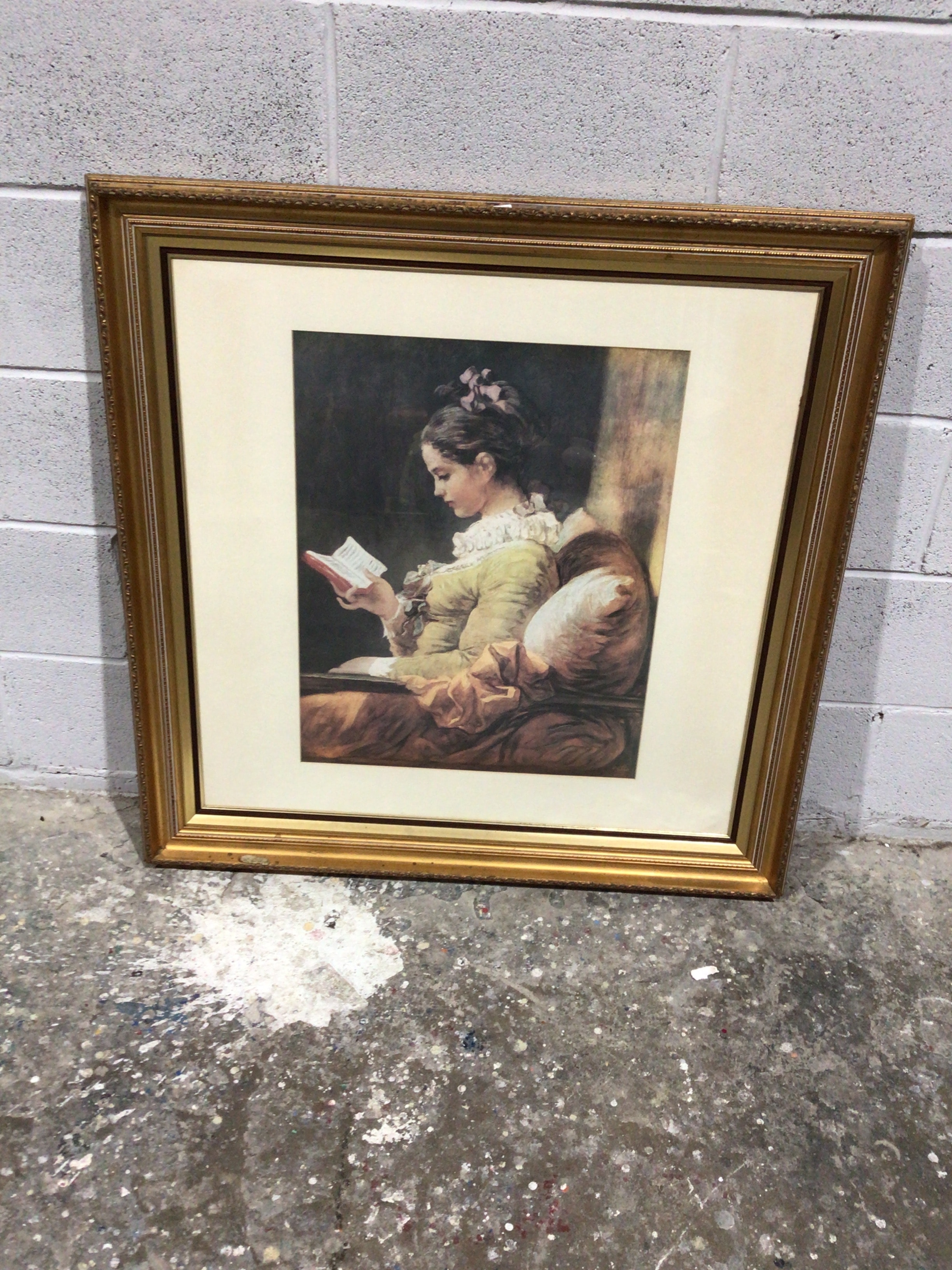 A framed decorative print depicting ‘Young Girl Reading’ by Jean-Honore Fragonard. The subject is a young woman engrossed in reading a small book, depicted in 18th-century Rococo or Neoclassical attire, characterized by a ruffled collar, a light-colored dress, and a pink bow in her upswept hair. She is seated in a plush armchair against a dark background. The print is presented under glass, set within a wide, off-white mat, and housed in an ornate, gold-colored wooden or composite frame. No visible text or markings are apparent on the image or mat.