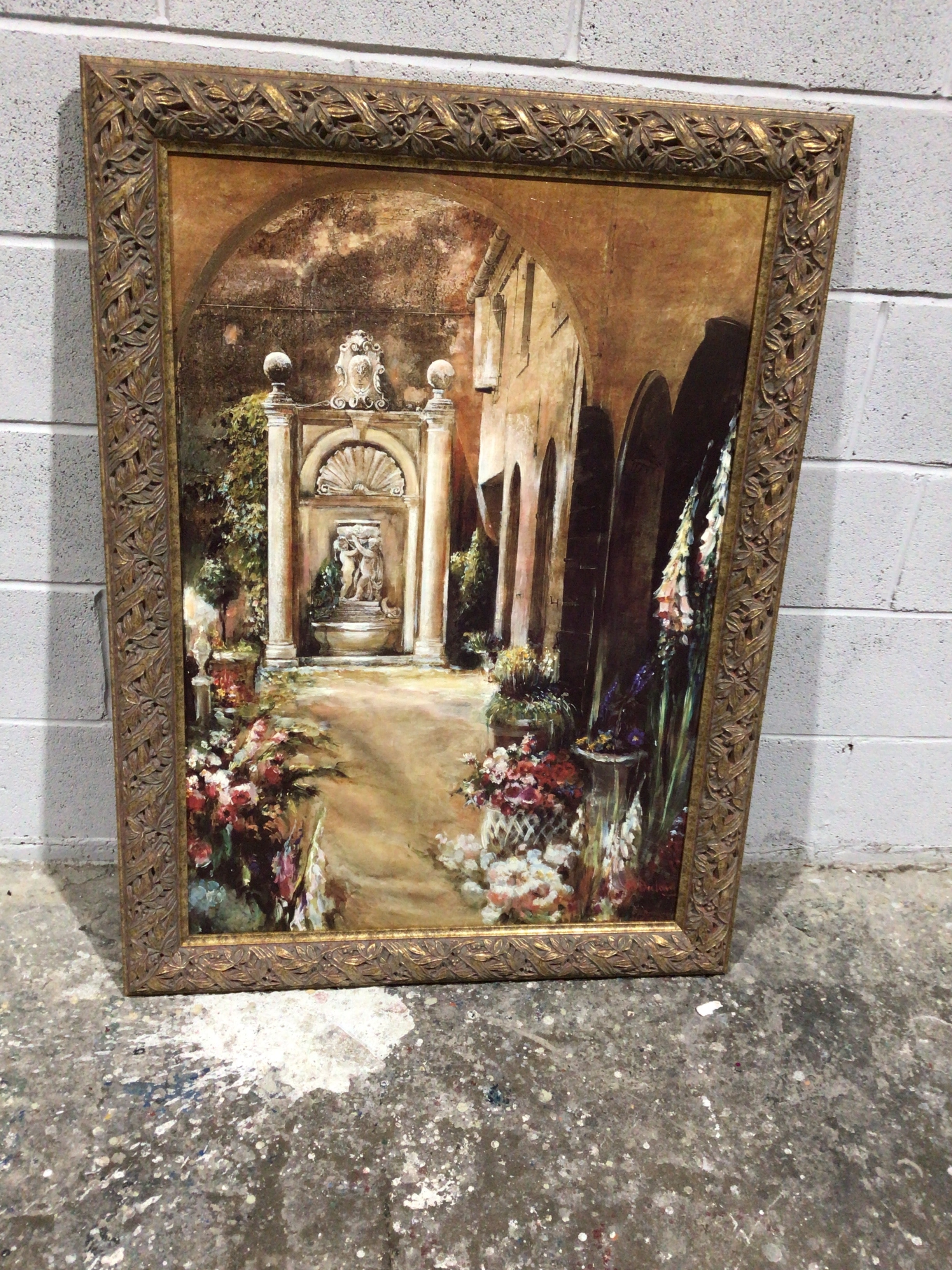 A framed oil on canvas depicting a picturesque European-style courtyard scene. The central feature is an ornate classical fountain with figural sculptures, surrounded by lush potted and planted flowers, set against architectural elements including arches and building facades. The composition is rendered in warm, earthy tones with visible brushwork, suggesting a representational or impressionistic style. It is housed in an ornate, gilded frame, possibly carved wood or composition, featuring continuous foliate and berry motifs.