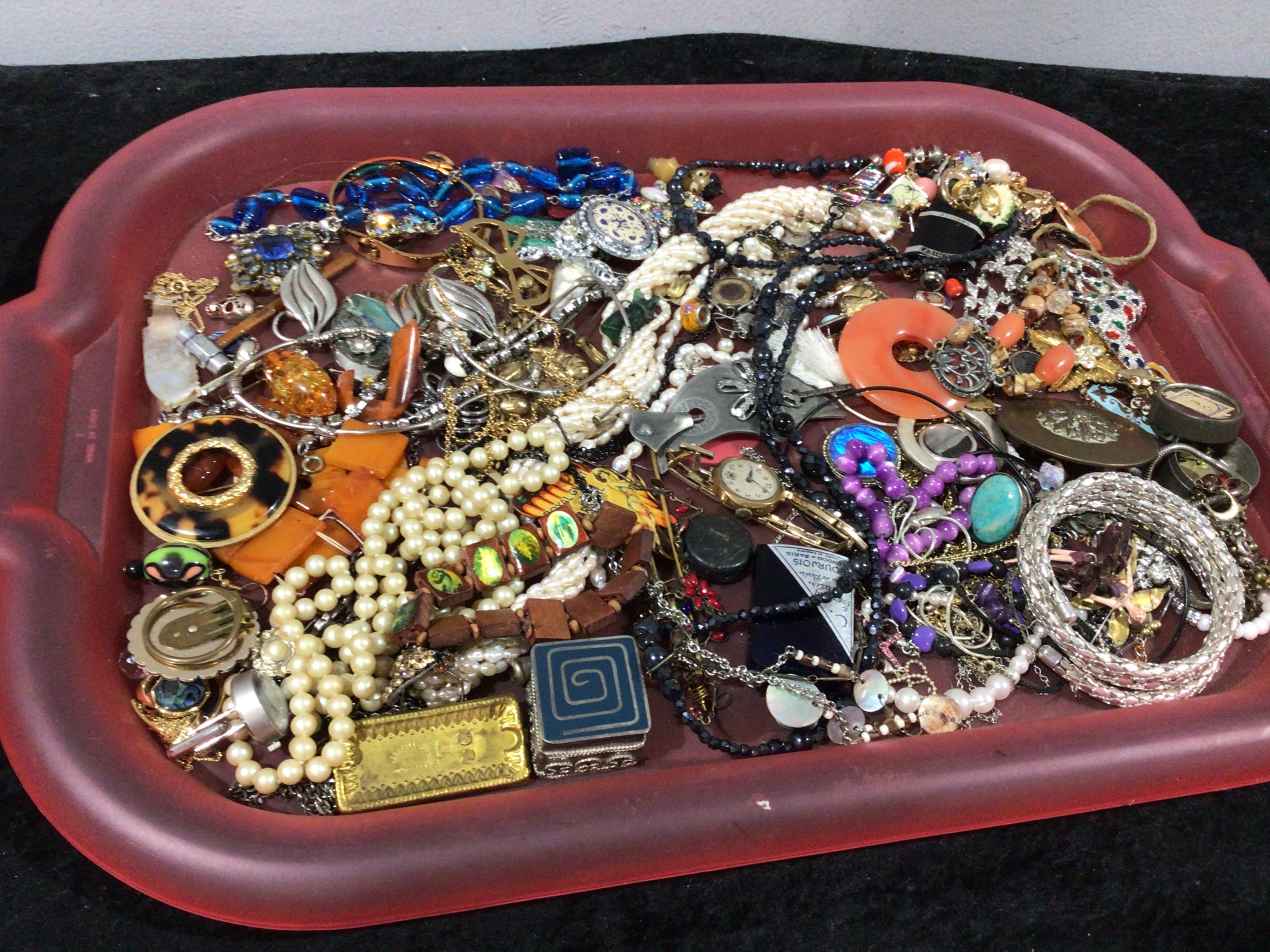 A collection of miscellaneous costume jewelry and accessories, presented in a red plastic tray. The eclectic assortment includes necklaces, bracelets, brooches, rings, and earrings, along with a small gold-tone wristwatch and various small decorative boxes or compacts. Materials observed include base metals (gold and silver-tone), glass and plastic beads in various colors (blue, black, purple, amber, orange), imitation pearls (both round and baroque styles), wood, shell (e.g., mother-of-pearl), and faux tortoiseshell elements, as well as stones resembling turquoise. Visible markings include “BOURJOIS LONDON – PARIS” on a small black and white box and “ROYAL GL…” on a pendant. Styles vary, suggesting accumulation from the mid-20th century to more recent decades.