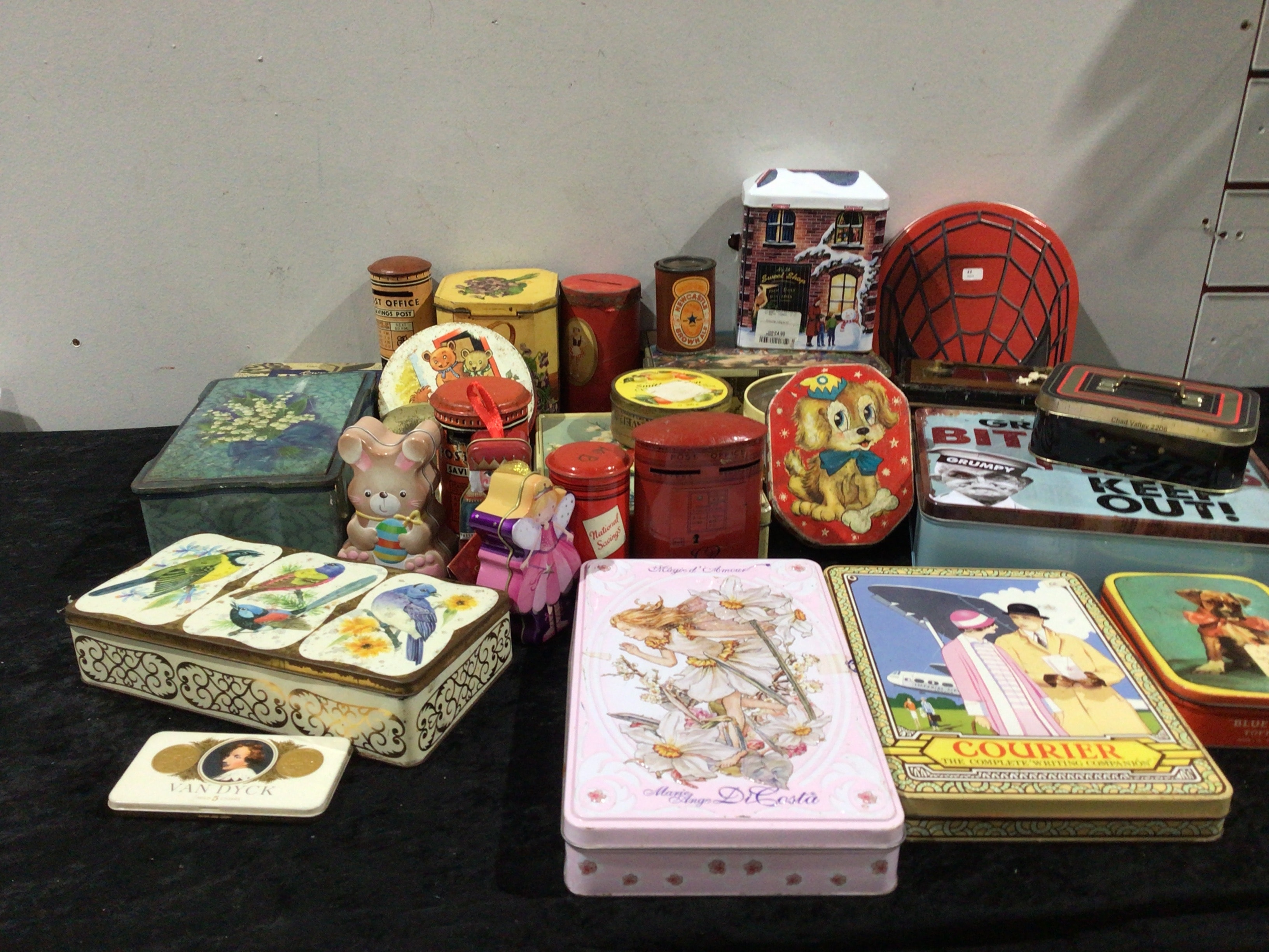 A collection of approximately 25-30 vintage and decorative metal tins and boxes, predominantly constructed from lithographed tin-plated steel. The assortment features diverse shapes including rectangular, square, oval, octagonal, and cylindrical, alongside novelty forms such as a Christmas-themed house, a pink bunny, a red cylindrical post box, a red Spiderman mask, and a black safe. Decorations encompass a wide range of printed designs, from floral and avian motifs to anthropomorphic animals (a dog, bears), figures (fairies, a historical portrait, a couple), landscapes, and seasonal imagery. Visible text and markings include “POST OFFICE SAVINGS POST, ” “Newcastle, ” “Sweet Shop, ” “GRUMPY BIT KEEP OUT!, ” “Chad Valley 2206,” “National Savings, ” “VAN DYCK, ” “Magie d’Amour Di Costa” (translating to “Magic of Love Di Costa”), “THE COURIER THE COMPLETE WRITING COMPANION, ” and partially visible “BLUEBIRDS TOFFEE.” One item also bears a price sticker of “£4.99.”