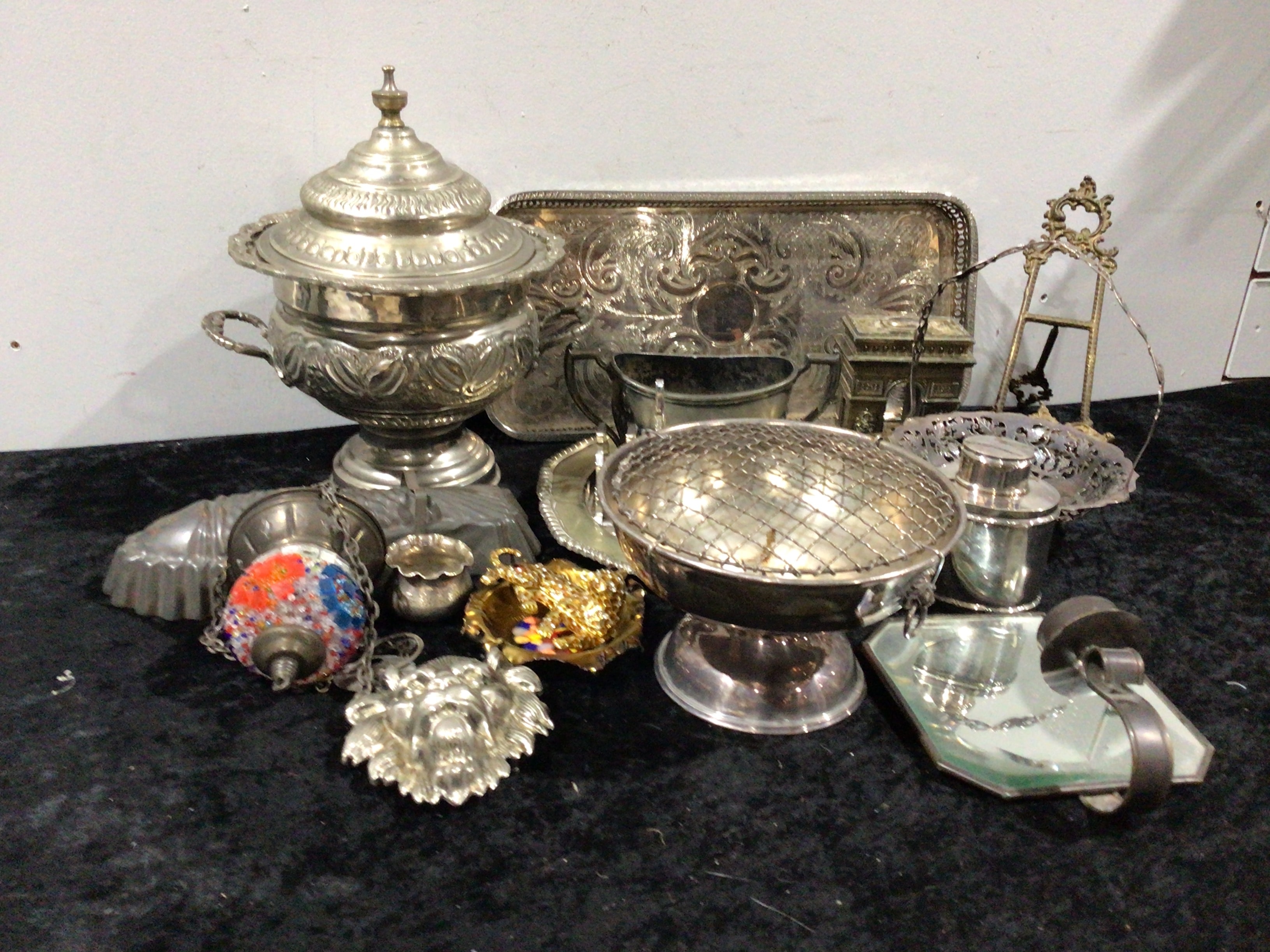 This large grouping comprises approximately fifteen diverse decorative and functional objects, predominantly crafted from tarnished silver-colored metal, likely silverplate, with a few items appearing to be brass or gilt metal, and one featuring colorful mosaic or enamel work. Notable pieces include a large ornate lidded urn or tureen, a rectangular serving tray with elaborate scrollwork, various smaller dishes (including one with a domed grid cover and another crescent-shaped with filigree), a mirrored plateau, a fluted mold, and several decorative elements such as an ornate easel-style frame, a sculptural lion’s head, and a small gilded bowl. The prevailing aesthetic, particularly among the highly decorated silver-colored items, suggests a Rococo Revival or Victorian period style.