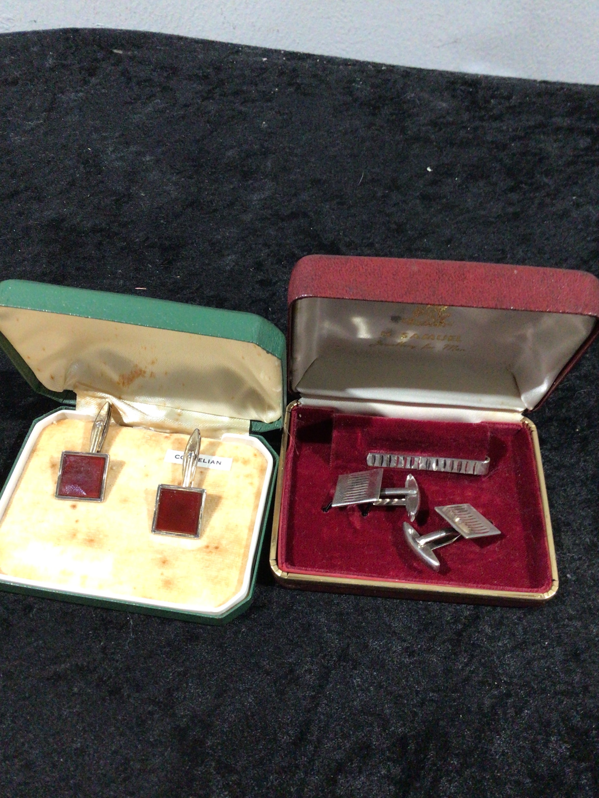 Two Boxed Sets of Vintage Silver Men's Cufflinks and Tie Bar, including Carnelian