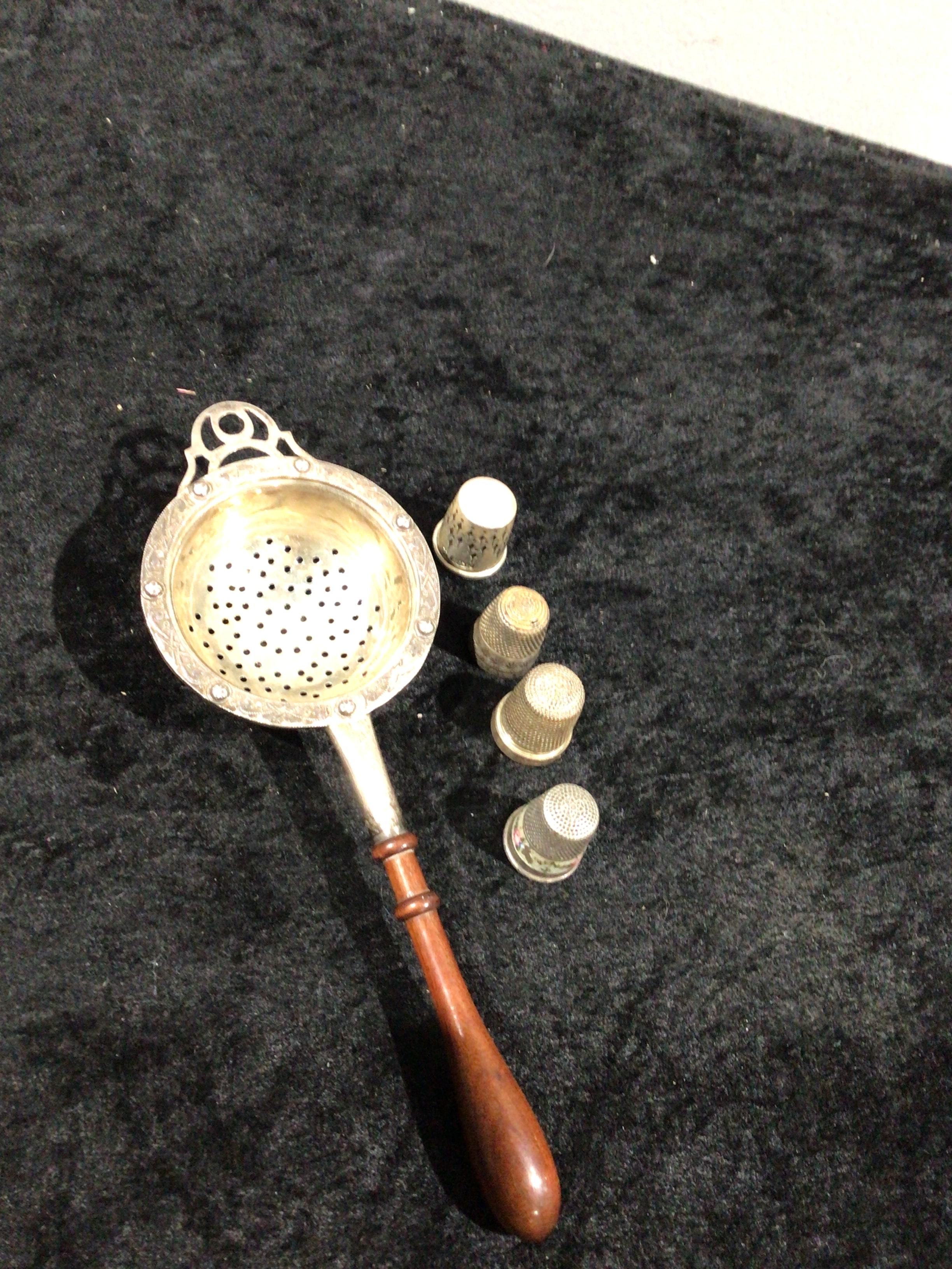 A vintage silver tea strainer, noted to be made in England, featuring an ornate, pierced top handle, a circular perforated bowl with an engraved or chased rim, and a turned wooden handle. Accompanying the strainer are four silver thimbles. Two thimbles feature textured, dimpled surfaces, one displays an embossed or etched geometric pattern, and another has an enameled band with floral decoration.