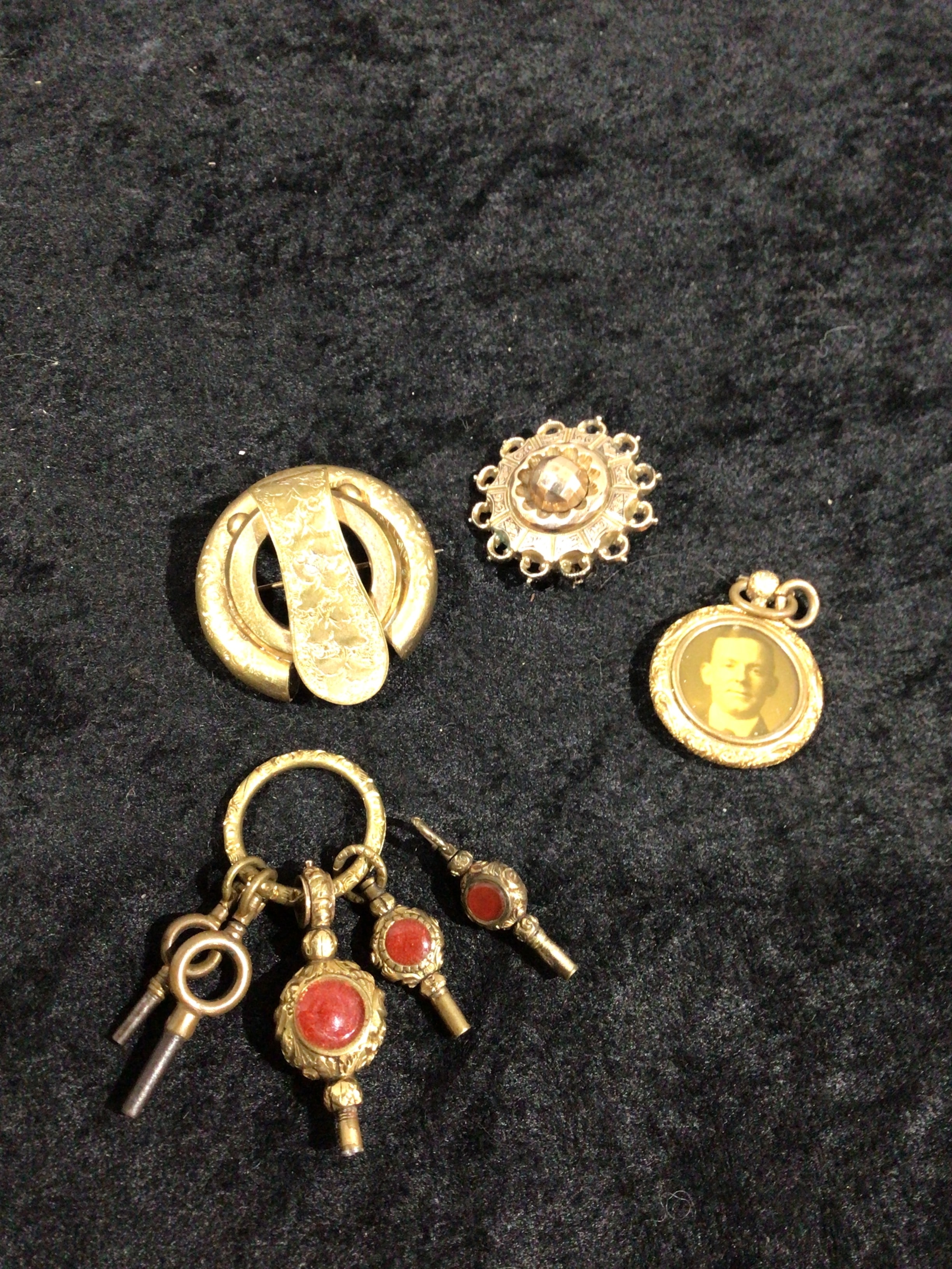 A collection of Victorian rolled gold personal accessories, comprising five items. The lot includes two distinct brooches: a larger, ornate circular brooch with extensive engraved floral or foliate patterns and a central bar element, and a smaller, decorative round brooch featuring a central faceted clear stone surrounded by intricate metalwork. Also present is a small oval locket or pendant displaying a sepia-toned photograph of a man, complete with an ornate bezel and a suspension loop. The final grouping consists of a decorative ring holding five watch keys or winding tools, three of which are elaborate and adorned with a prominent red cabochon stone or enamel inlay, along with two simpler, smaller keys. These items are primarily crafted from gold-toned metal, likely dating from the late 19th to early 20th century. No discernible manufacturer’s marks or textual engravings are visible.
