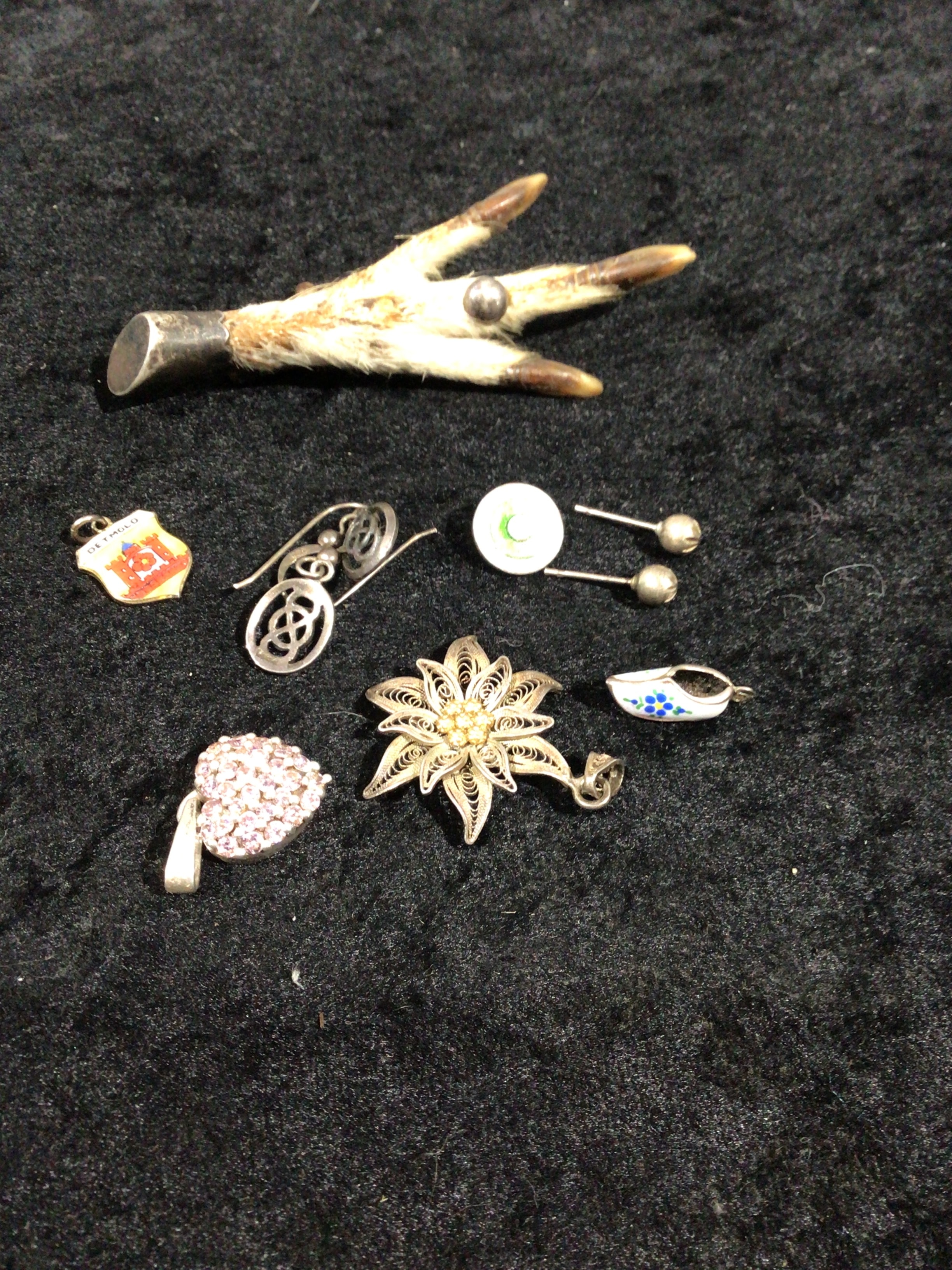 A vintage sterling silver cannetille filigree flower brooch, designed with delicate wirework and featuring gold-toned accents at its centre, consistent with an Edelweiss motif. Accompanying this is a collection of diverse Silver small jewellery items and components. This includes a distinctive pendant or brooch crafted from a preserved animal foot, likely a bird’s talon, fitted with a silver-toned metal cap and a small metallic bead. Also present is a heart-shaped pendant adorned with numerous small pink rhinestones set in a silver-toned metal. The assortment further comprises three earring components: a silver-toned dangle earring with an openwork, possibly Celtic-inspired design; a single stud earring with a white circular face featuring a green crescent motif; and a loose, spherical silver-toned bead. Completing the group are a small white enamel or ceramic slipper charm detailed with blue and green floral patterns, and a shield-shaped souvenir charm with a colorful enamel depiction of a castle and flower, bearing the text ‘DETMOLO’ (Detmold).