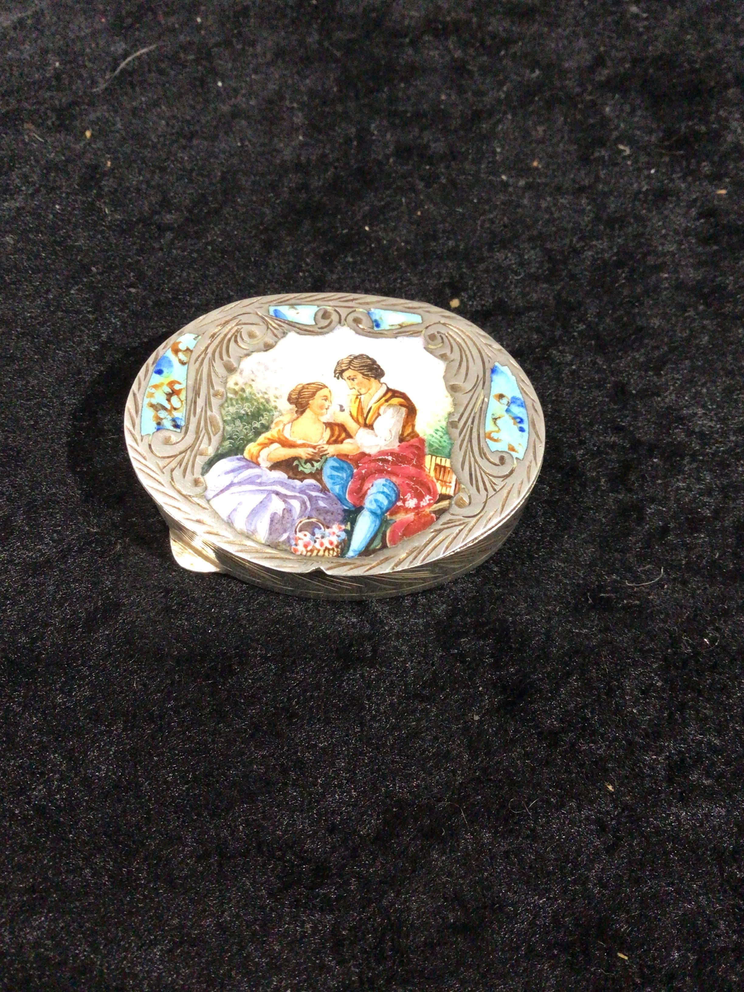 An oval-shaped hinged box, identified through web intelligence as Italian 800 silver and enamel. The lid is adorned with a central rectangular enamel plaque depicting a Rococo-style romantic or pastoral scene featuring a man and a woman in 18th-century attire. This central scene is framed by elaborate engraved scrollwork and smaller champlevé enamel accents in blue, green, and orange, exhibiting a Rococo Revival aesthetic. The interior surfaces are gilded. Visible markings on the interior of the lid include “13” (or “LB”), an indistinct “300” or “800” (consistent with 800 silver content), and “D.R.P.” (Deutsches Reichs-Patent). The base interior displays “16” and further indistinct hallmarks.