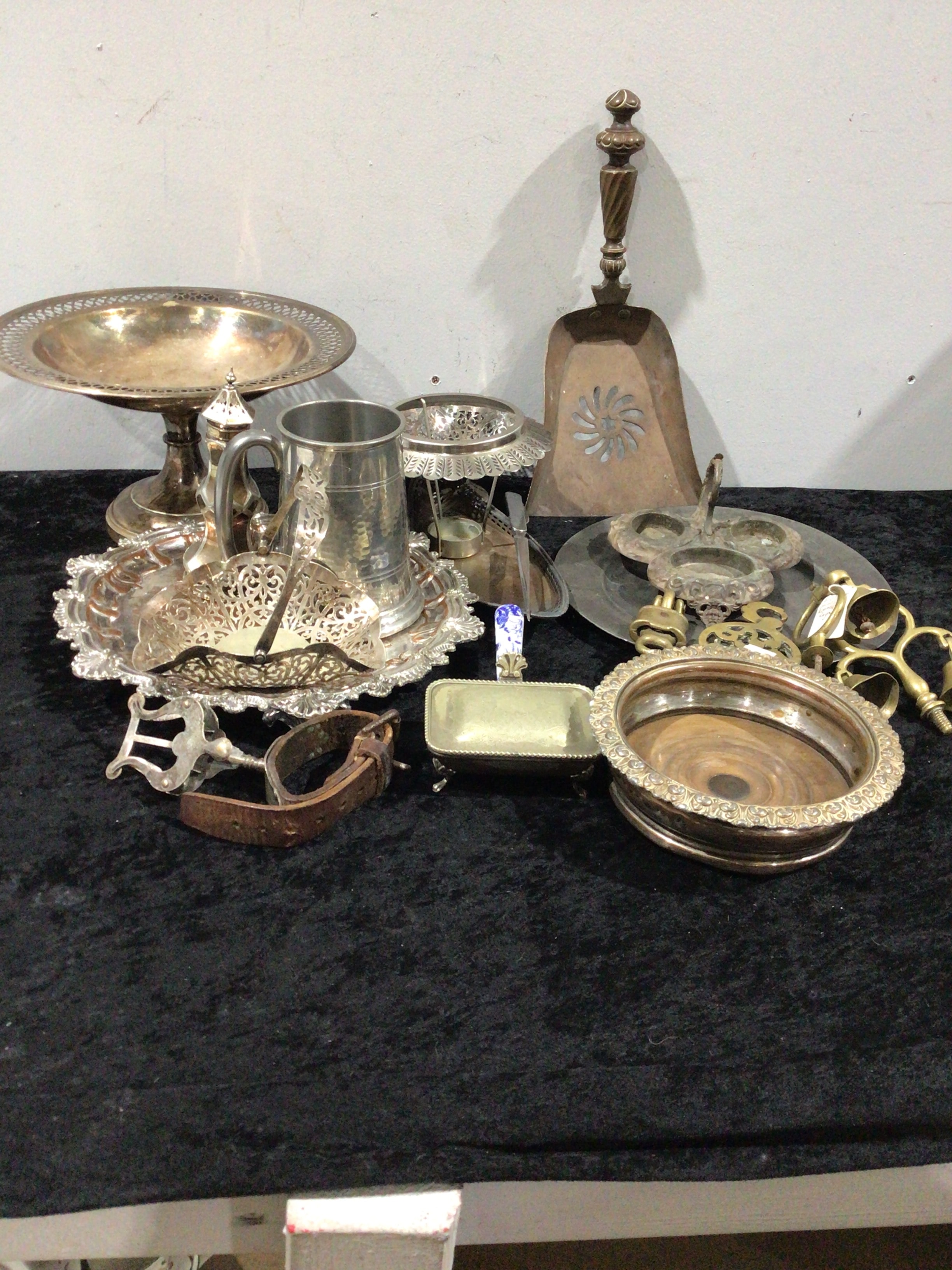 A collection of approximately fifteen metalware and related items, primarily composed of silver-toned metal, likely silverplate or pewter, alongside some brass or bronze-toned pieces. Key objects include a footed compote, an ornate pierced serving tray, a hammered tankard, a small rectangular lidded box on feet, a circular bottle coaster with a wooden insert, and a three-compartment condiment stand. Other notable items are a large decorative shovel with a carved-style handle, various small fittings, a wide leather strap, and a diminutive blue and white porcelain thimble-like object. The styles present a mix of ornate, pierced, and hammered finishes, suggesting a possible age range from the late 19th to mid-20th century.