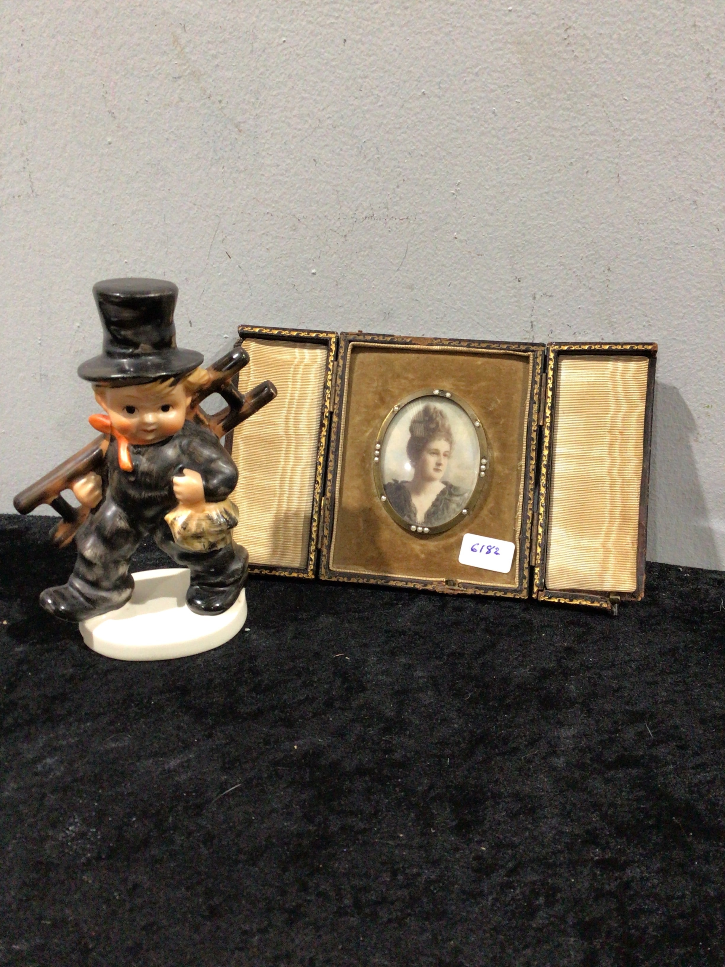 A Hummel Goebel 'Chimney Sweep' Figurine and a Gilt Metal Triptych Photo Frame With Miniture painting