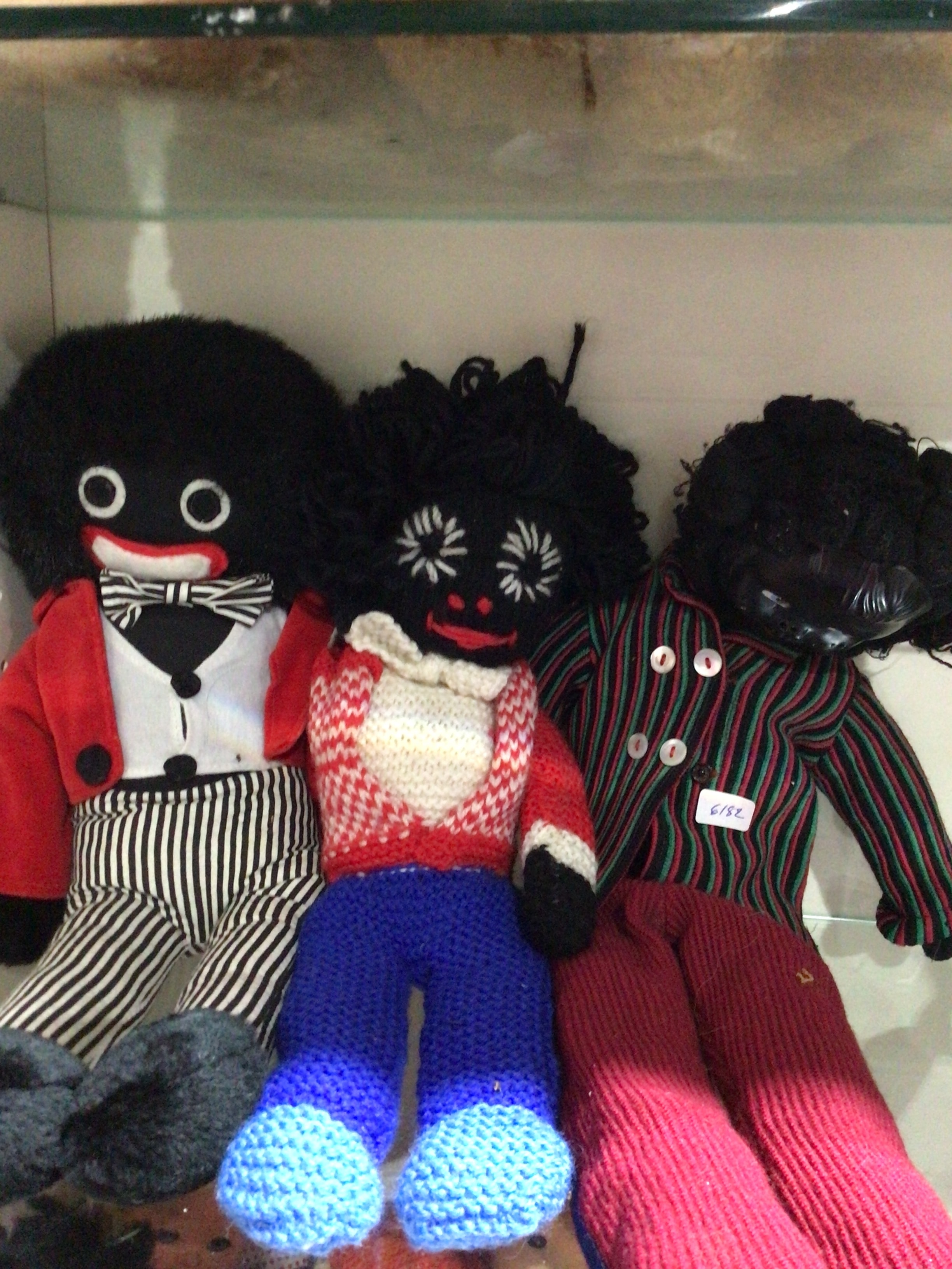 A group of three vintage Golli dolls, each of distinct construction. The leftmost doll is crafted from plush fabric with black fur-like hair, featuring large white-ringed eyes with black pupils, and dressed in a red jacket, white shirt with a black and white striped bow tie, and black and white striped trousers. The central doll is entirely knitted from yarn, presenting with black yarn hair, white embroidered asterisk-style eyes, a red embroidered mouth and nose, and is clothed in a red and white knitted top, blue knitted trousers, and light blue knitted feet. The rightmost doll, potentially with a plastic or hard material face, has black yarn hair, and wears a green, red, and black striped knitted jacket with white buttons and dark red knitted trousers/legs. A white label with the number “6182” is attached to the striped jacket of the rightmost doll, and a subtle ‘L’-like mark is visible on its red leg.
