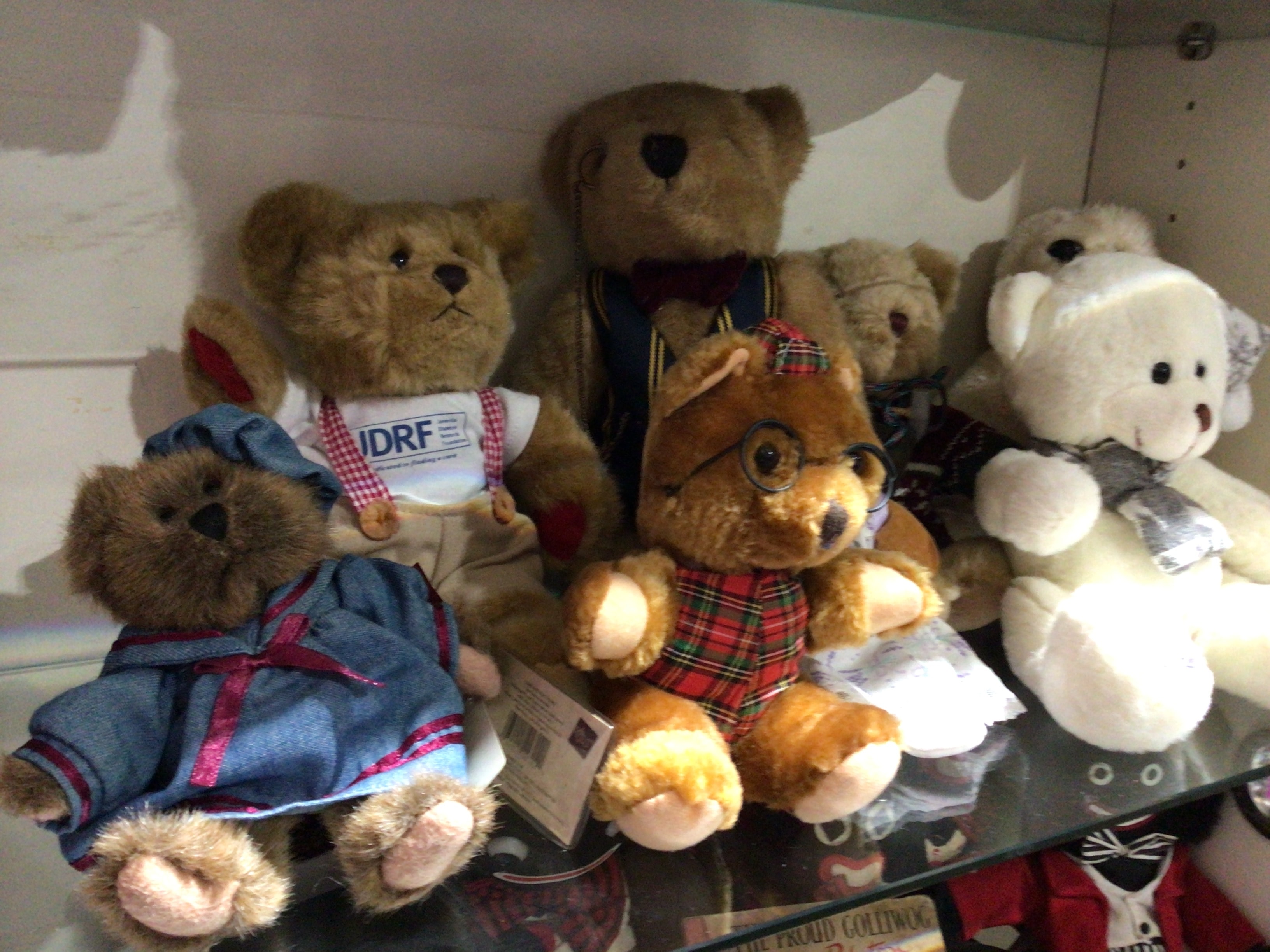 A collection of approximately six to seven contemporary plush teddy bears, primarily in shades of brown and white. The bears are dressed in various textile outfits, including a denim jacket with pink trim, a red and green plaid shirt worn by a bear with circular glasses, a blue vest with a burgundy bow tie, and a gray scarf. One medium brown bear wears a white t-shirt prominently displaying the logo “JDRF” with the accompanying text “Juvenile Diabetes Research Foundation. Dedicated to finding a cure.” Several bears appear to retain original retail tags on their limbs. The bear with circular glasses and a plaid shirt is consistent with descriptions of a ‘Vintage PMS Teddy Bear In Tartan wearing Glasses & Hat’ found in web intelligence. Other bears in the collection may include examples by makers such as Belkie Bear, Charter Club, Dakin, and Commonwealth Toy Company, based on visual matches from web research.