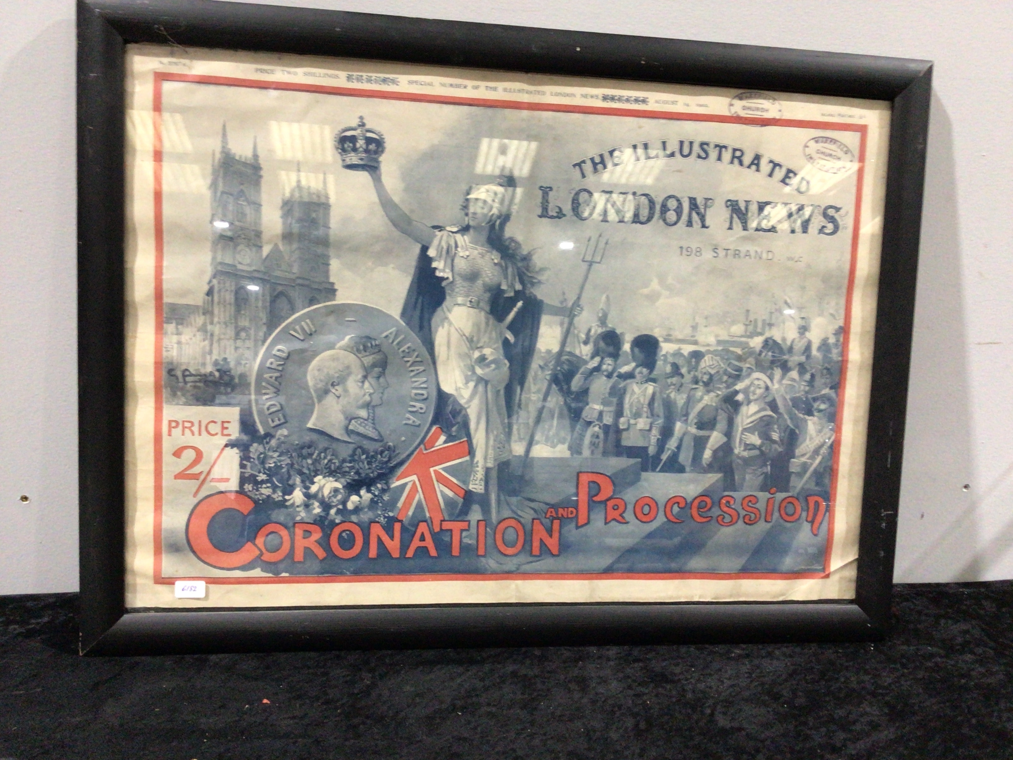 An antique special issue print from ‘The Illustrated London News,’ dated August 16, 1902. This framed print on paper commemorates the ‘Coronation and Procession’ of Edward VII and Alexandra. The illustrative design features a classical female figure holding a crown, a gothic cathedral, and a military procession in the background. A prominent medallion displays profile portraits of Edward VII and Alexandra, accompanied by a Union Flag. Additional visible text includes ‘THE ILLUSTRATED LONDON NEWS,’ ‘PRICE TWO SHILLINGS,’ and ‘198 STRAND, W.C.’ The print is housed under glass in a simple black wooden frame.