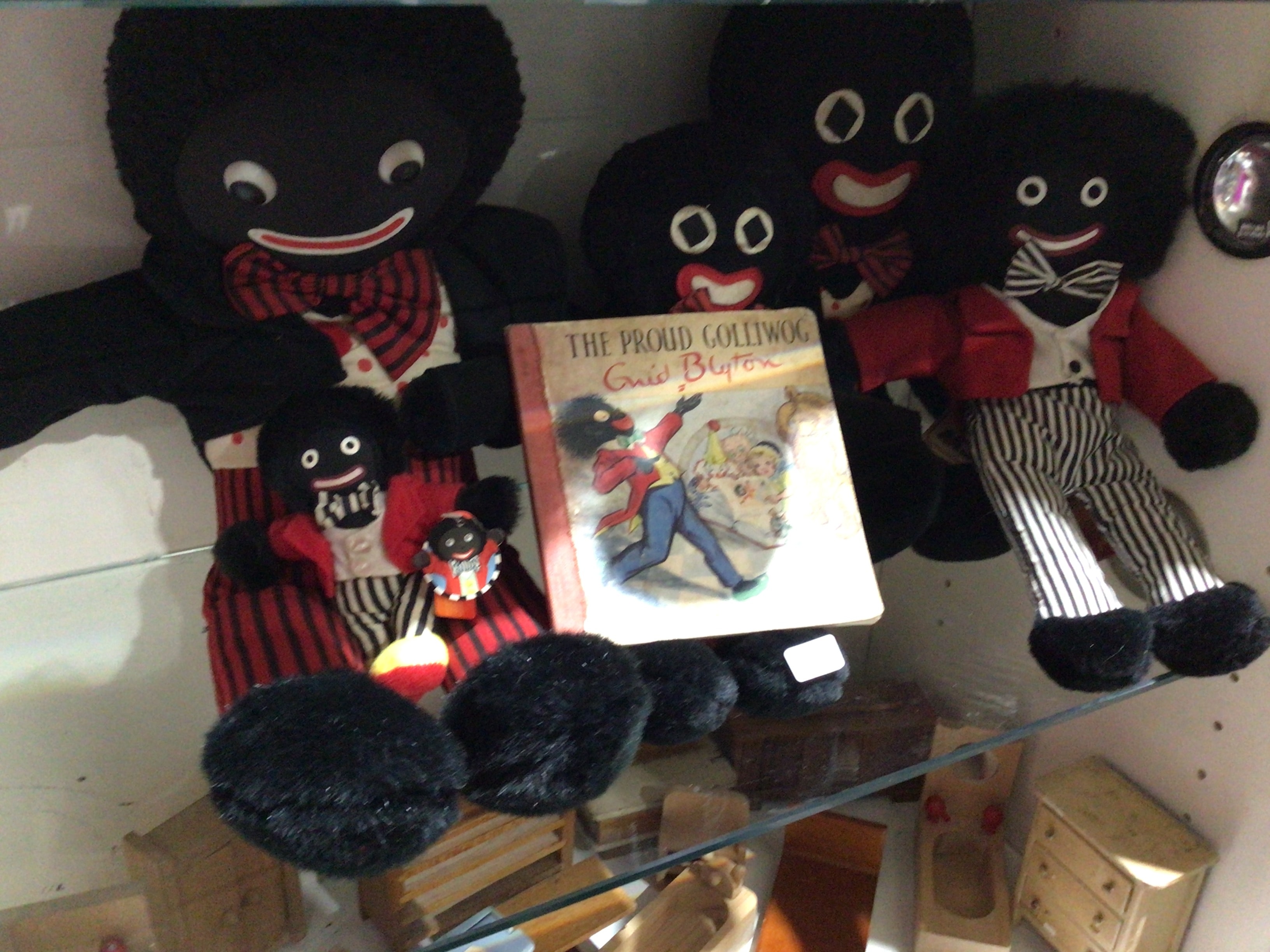 A collection of five plush ‘Golli’-style dolls, featuring black faces, red lips, and dressed in various fabric outfits including bow ties and striped trousers. Accompanying this collection is a children’s book titled ‘THE PROUD GOLLI by Enid Blyton’.