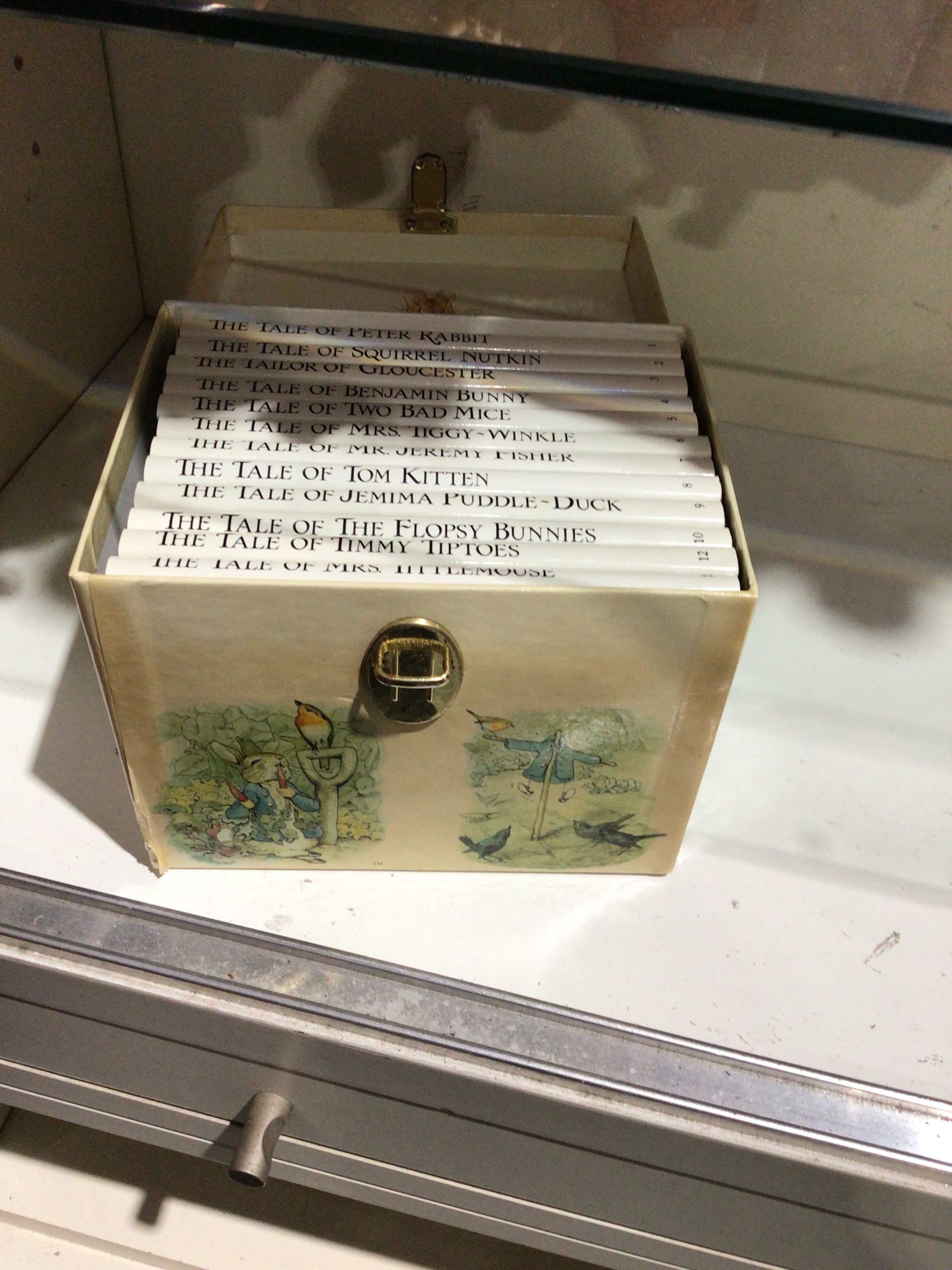 A set of twelve miniature books from ‘The World of Peter Rabbit’ by Beatrix Potter. The collection is presented in a decorative hinged-lid cardboard case with two brass-tone metal clasps. The exterior of the box features classic storybook illustrations depicting anthropomorphic animals, including a rabbit akin to Peter Rabbit, and a scarecrow, with a “TM” marking visible on the front. The books have white spines printed with black text, enumerating titles such as ‘The Tale of Peter Rabbit,’ ‘The Tale of Squirrel Nutkin,’ ‘The Tailor of Gloucester,’ ‘The Tale of Benjamin Bunny,’ ‘The Tale of Two Bad Mice,’ ‘The Tale of Mrs. Tiggy-Winkle,’ ‘The Tale of Mr. Jeremy Fisher,’ ‘The Tale of Tom Kitten,’ ‘The Tale of Jemima Puddle-Duck,’ ‘The Tale of The Flopsy Bunnies,’ ‘The Tale of Timmy Tiptoes,’ and ‘The Tale of Mrs. Littlemouse,’ numbered sequentially from 1 through at least 12.