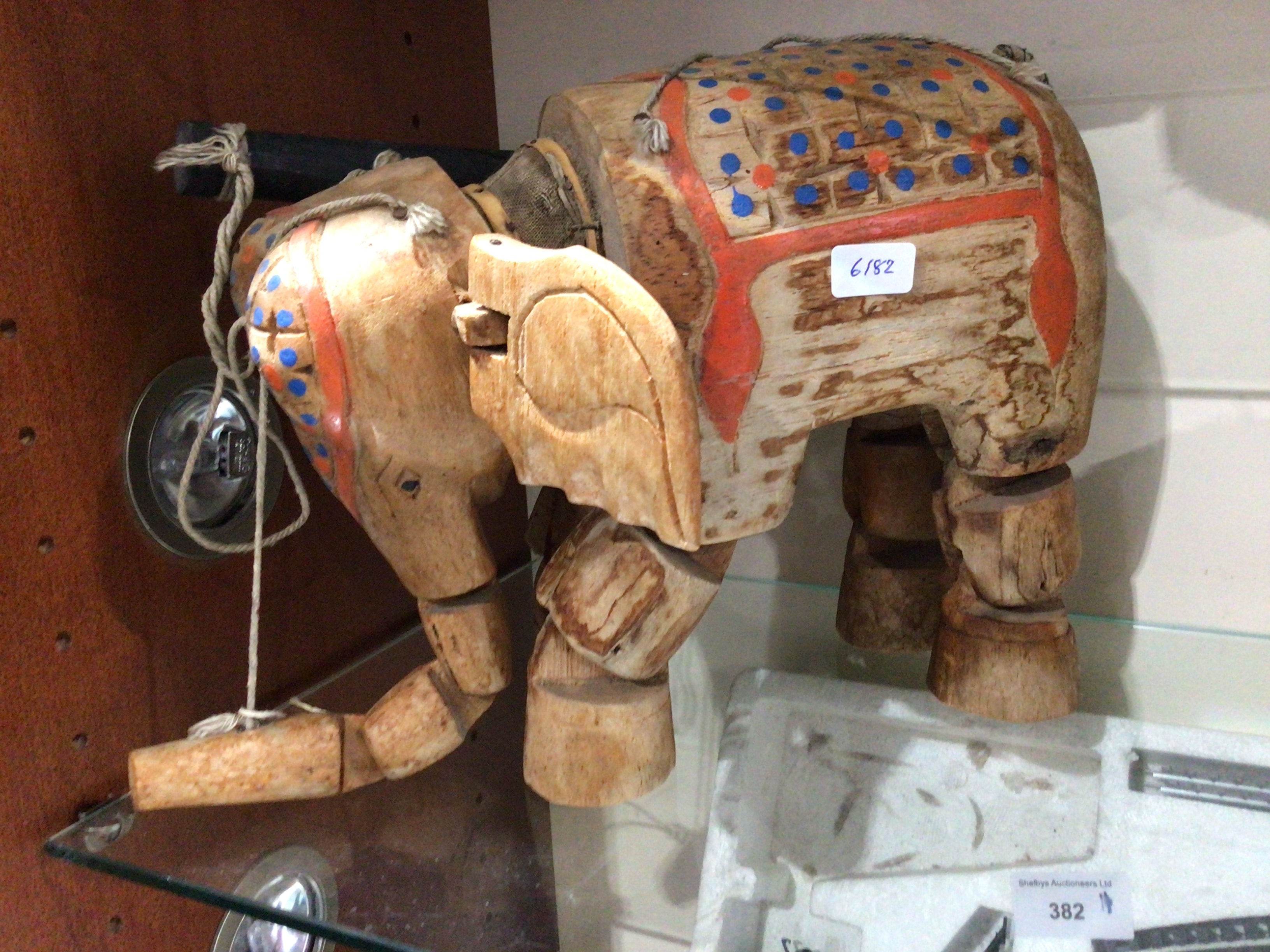 A vintage carved and painted wooden articulated elephant figure, likely executed in a folk art style. The item is constructed from segmented wooden pieces forming the body, head with prominent ears, trunk, and four legs, joined by visible mechanisms or ropes for articulation. Its natural wood tone is decorated with painted motifs, including a broad red outline simulating a saddle on its back, filled with carved rectangular patterns highlighted by alternating blue and orange dots. A cream-colored rope is fastened around the elephant’s neck and extends upwards. A white adhesive label displaying the handwritten number “6182” in blue marker is affixed to the elephant’s back.