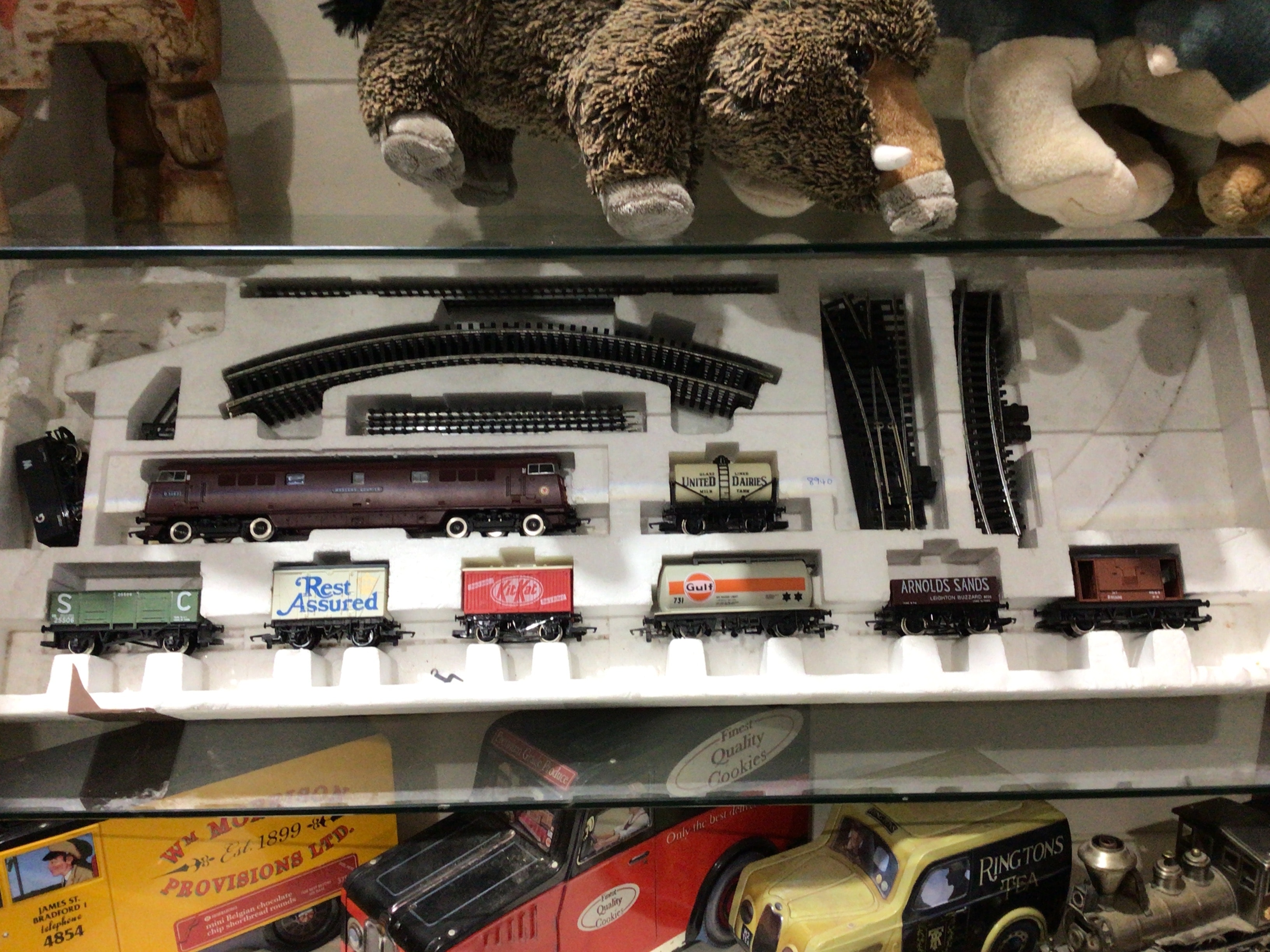 A Hornby OO R.538 Western Express Goods Set, likely from the mid-to-late 20th century, composed primarily of plastic and metal components. The set features a maroon diesel locomotive, partially marked “WESTERN MARINER” with the number D1667. Accompanying the locomotive is a collection of freight wagons, including a “UNITED DAIRIES MILK TANK,” a “GULF” branded tank wagon (numbered 731), a “KIT KAT” box van, a “REST Assured” box van, an “ARNOLDS SANDS” open wagon, and a green open wagon marked “S C 25506.” The set also contains various track sections, including curved, straight, and points/switches, all neatly organized within a white polystyrene insert. A handwritten number “8940” is visible on the insert. All visible text is in English.