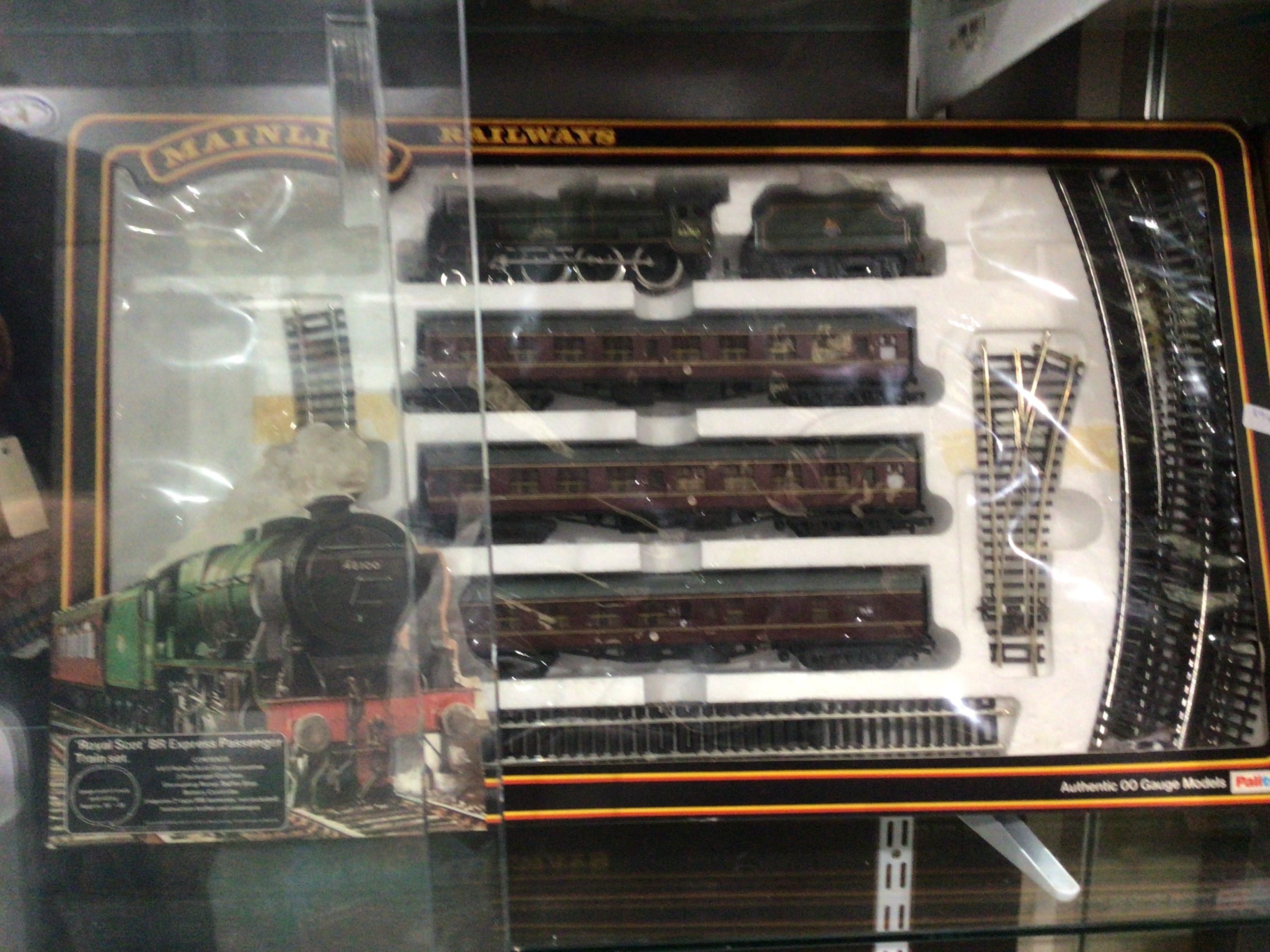 A Mainline Railways ‘Royal Scot’ BR Express Passenger Train Set, 00 Gauge. The set comprises a green steam locomotive numbered ‘46100’, a tender, three maroon passenger coaches, and track components. The models are constructed from plastic and metal, replicating British Railways (BR) era rolling stock. All components are housed within its original cardboard box with a clear plastic vacuum-formed lid. The packaging indicates ‘Authentic 00 Gauge Models’ and features a Palitoy brand logo.