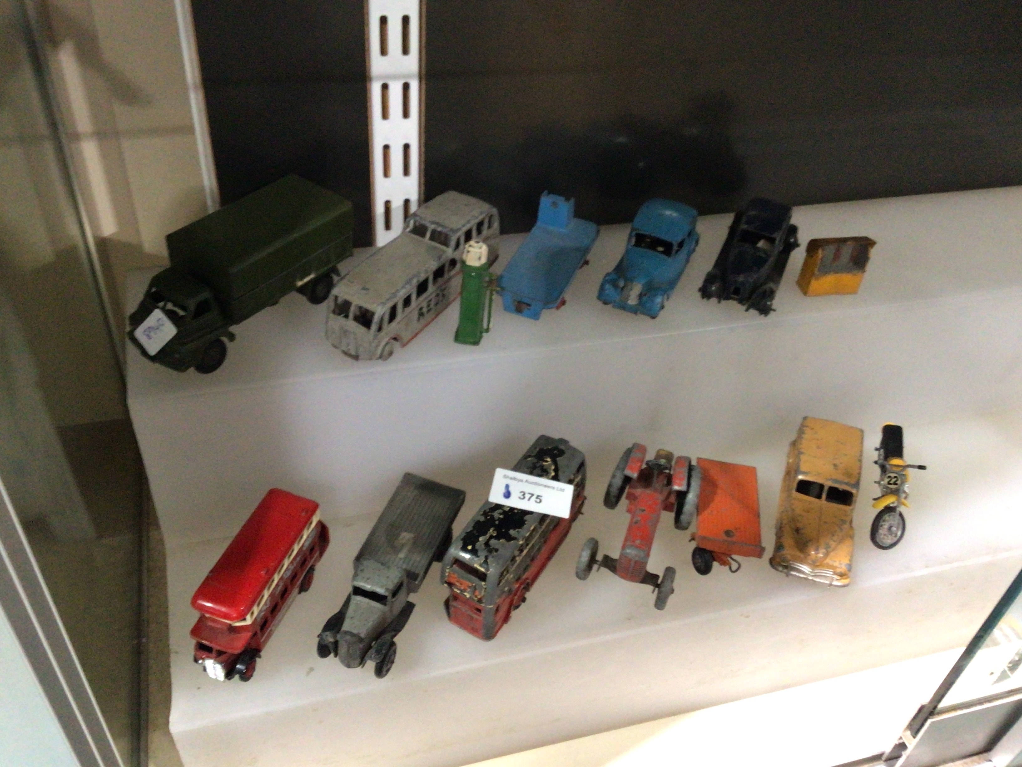 A collection of vintage Dinky Toy vehicle models, comprising fifteen die-cast model vehicles and a single green replica gas pump. The assortment primarily consists of metal-constructed toy vehicles from an apparent mid-20th-century period, featuring various cars, buses, trucks, a tractor with an attached trailer, and a motorcycle. Visible markings include “REDA” on the side of a grey bus, “248C” on a label affixed to a green truck, “375” on a white label on a red model, “Sibbys Auctioneers Ltd” on a label attached to another model, and the number “22” on the yellow motorcycle.