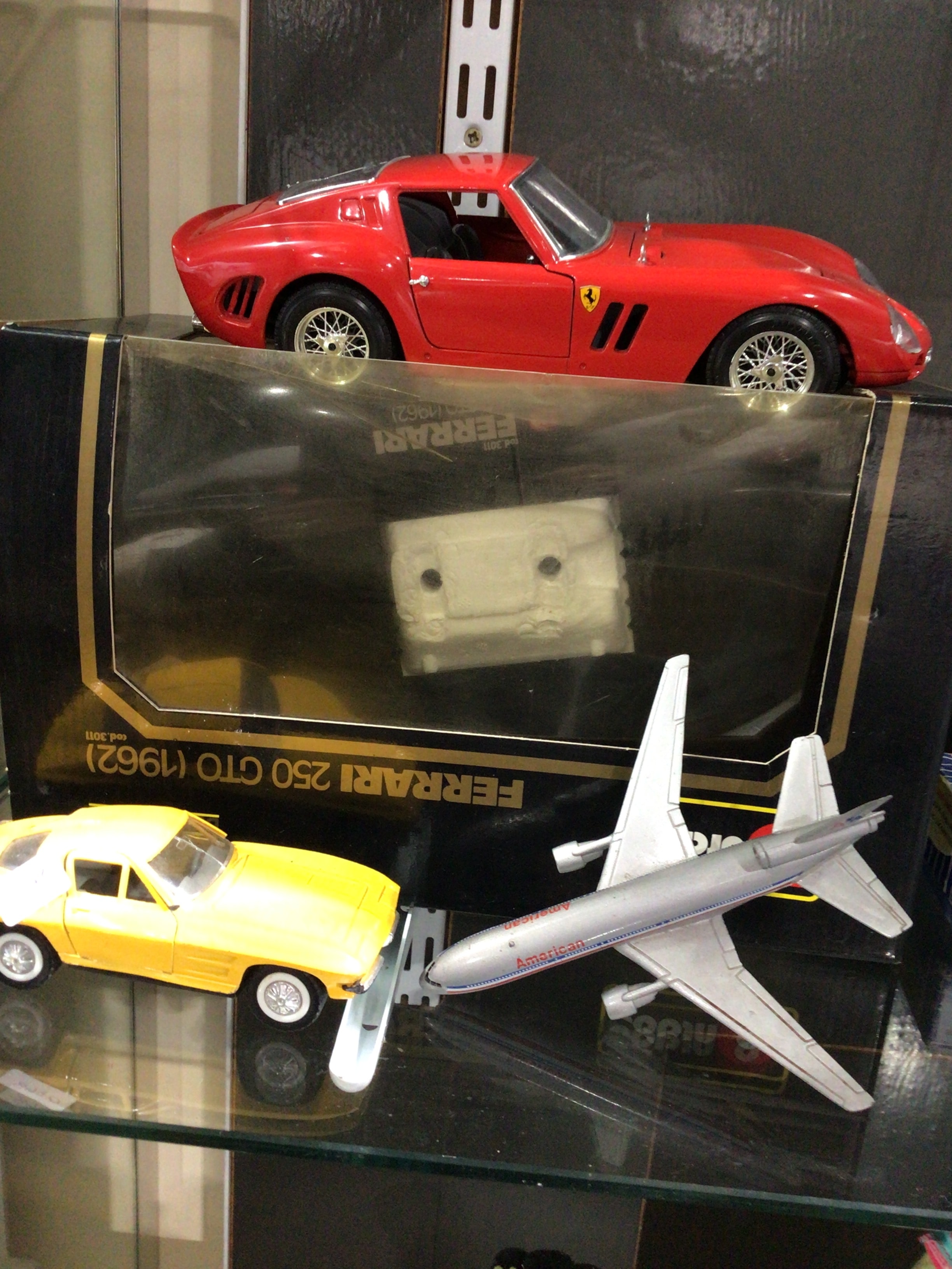 This lot features three model vehicles, primarily constructed from die-cast metal and plastic. The primary item is a red die-cast Bburago Ferrari 250 GTO (1962) model, identified by the “cod.3011” marking on its original black and gold retail box. The model exhibits wire-spoke wheels and the distinctive Ferrari prancing horse emblem. The box includes a clear plastic window revealing a white molded insert. Accompanying this are a yellow die-cast model sports car and a silver model airplane, which features “American” text on its fuselage and is adorned with red and blue livery details.
