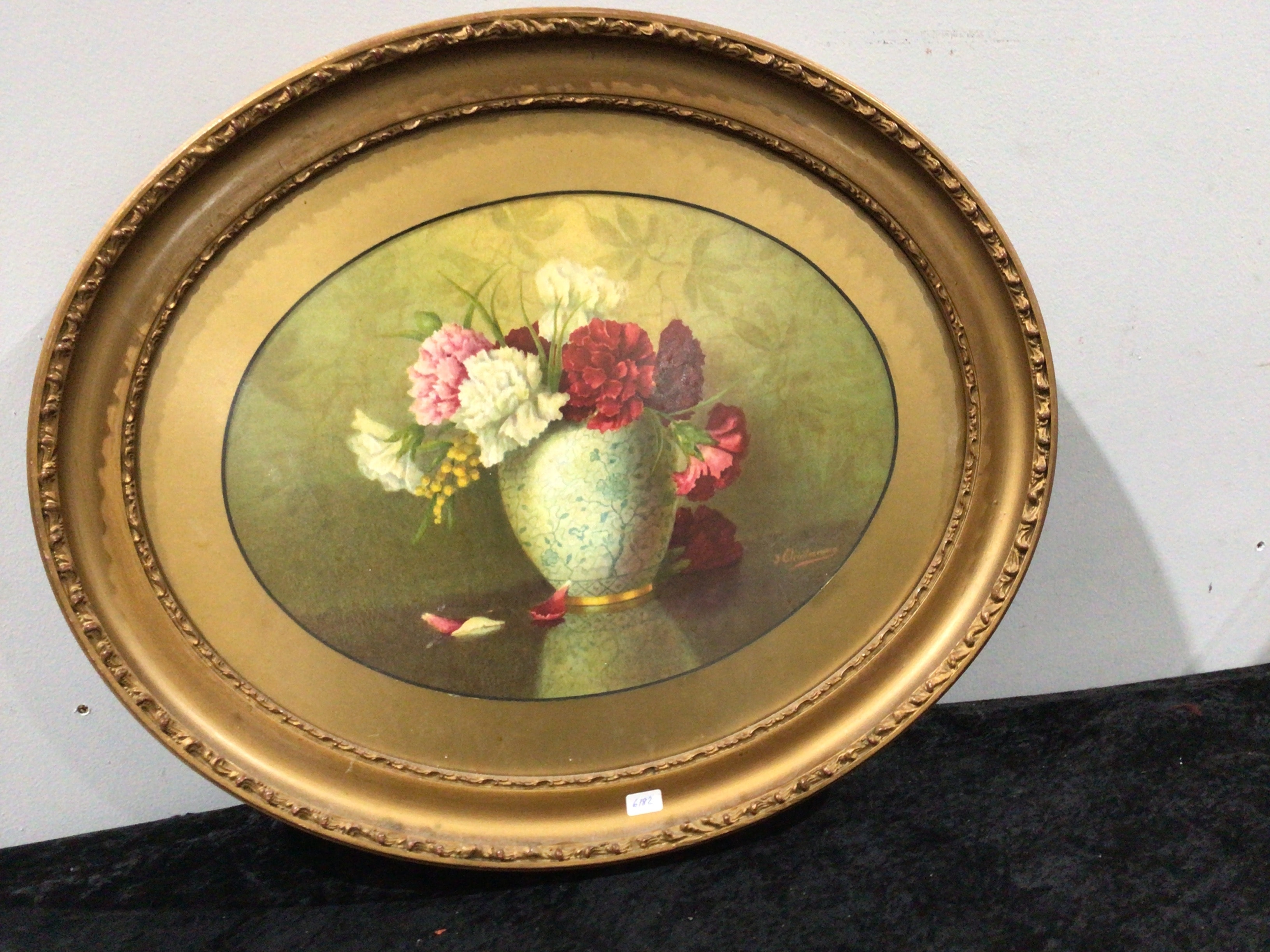 An oval framed print depicting a floral still life. The artwork features a light blue-green patterned vase holding a bouquet of pink, white, and red carnations and yellow flowering sprigs, with a few fallen petals on the dark surface below, all set against a muted green background. The piece is presented within a wide, plain gold-toned oval mat, enclosed by an ornate, gilded oval frame with decorative molding. A signature, appearing to read y chovanna ‘ is visible in the lower right corner of the artwork. A white sticker with ‘5182’ is affixed to the lower right of the frame, likely an inventory or lot number.
