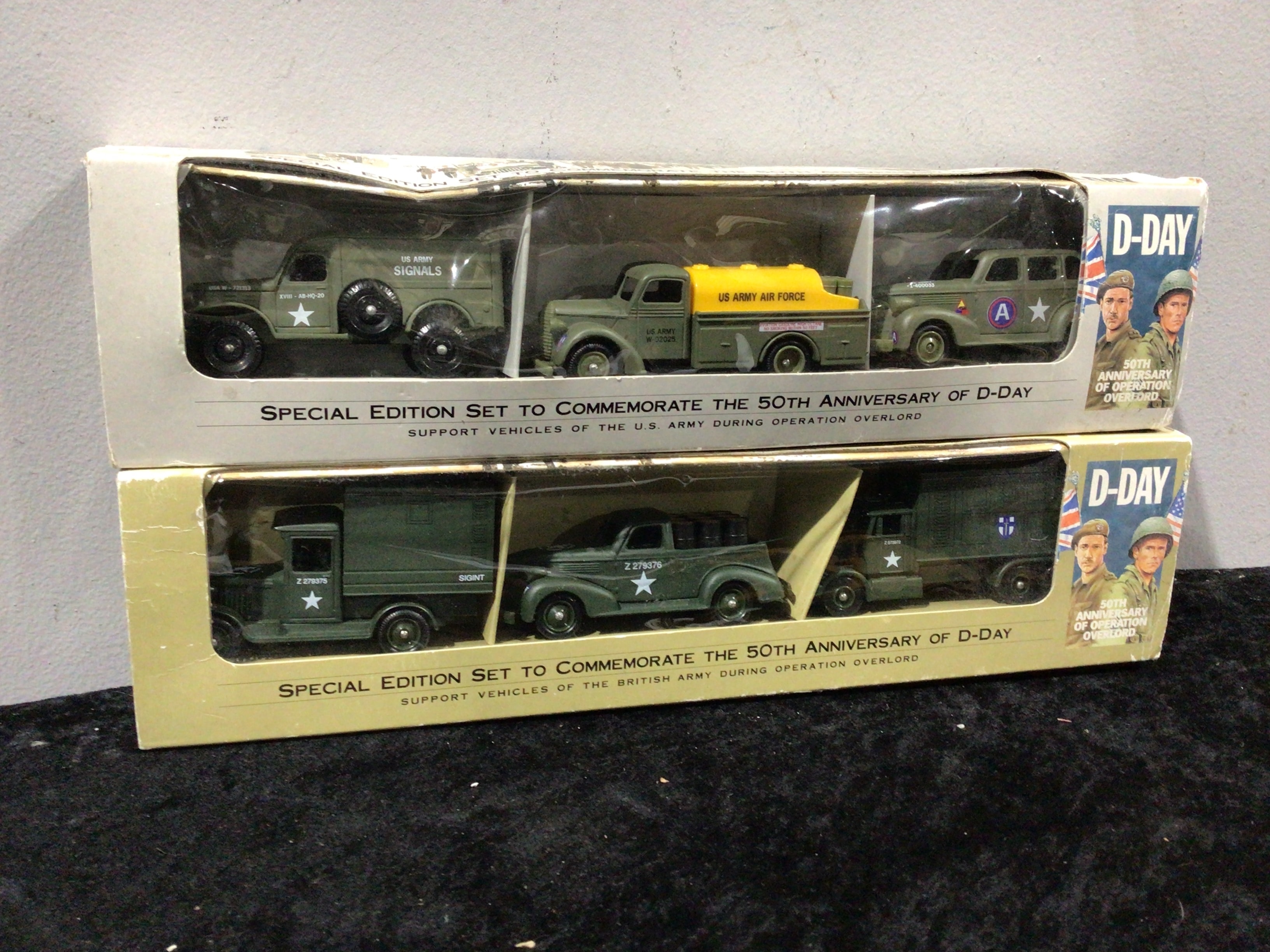 Two Lledo Days Gone Special Edition D-Day 50th Anniversary die-cast vehicle sets. Each set is sealed in its original cardboard and clear plastic packaging, commemorating the “D-DAY 50TH ANNIVERSARY OF OPERATION OVERLORD” and indicating a 1994 release. The top set features three green vehicles marked with “U.S. ARMY” identification, including “SIGNALS” and “AIR FORCE” designations, alongside numeric codes (e.g., “USA W-721313”). The bottom set contains three green vehicles marked for the “BRITISH ARMY,” with designations like “SIGINT” and various “Z” prefix numeric codes (e.g., “Z 279375”).