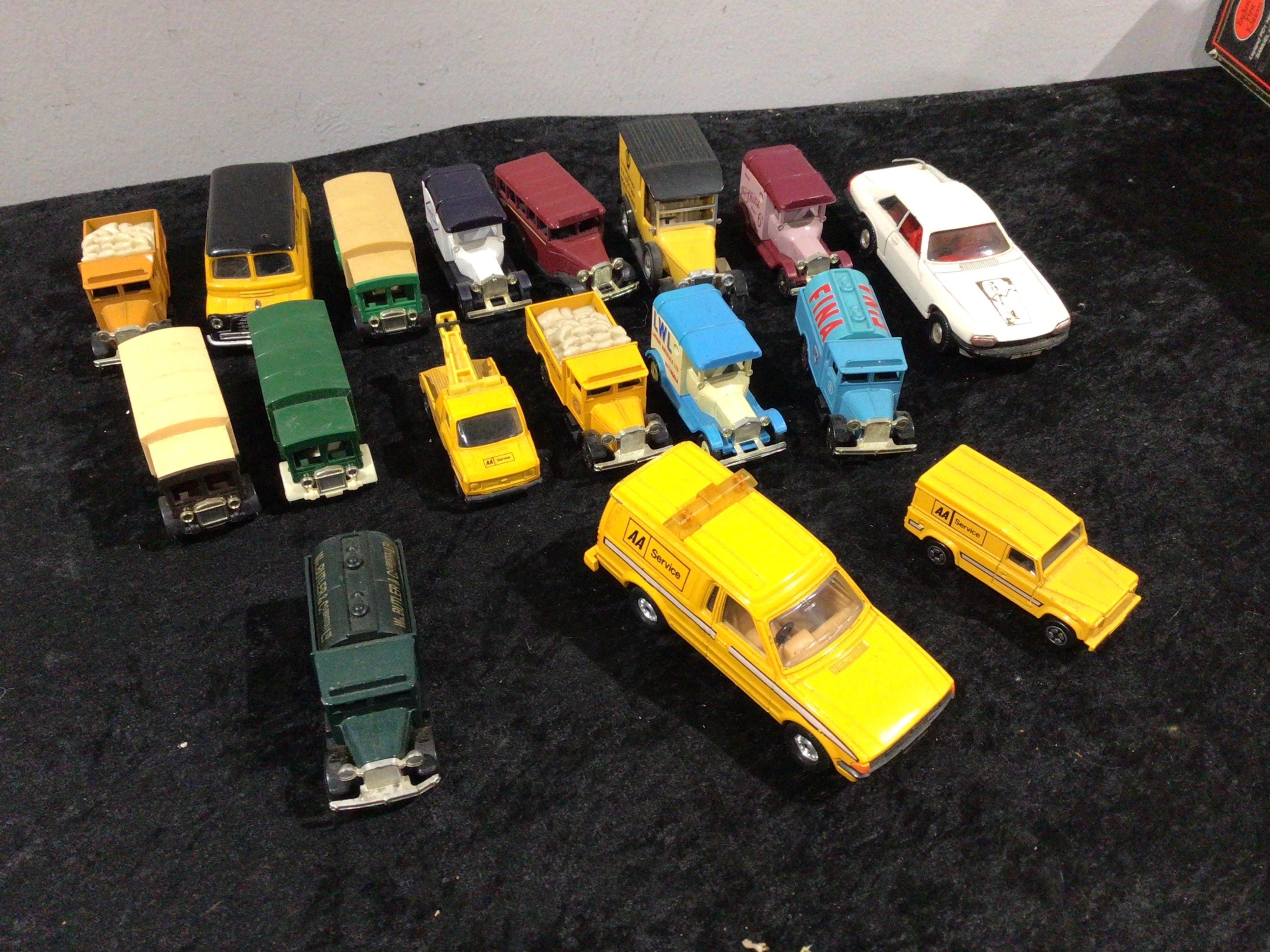 A collection of fifteen die-cast and plastic toy vehicles, predominantly depicting vintage and classic automotive styles, alongside a few more modern examples. The collection includes several Corgi models, notably a Ford Escort AA Service van and car, as identified by web intelligence. The vehicles comprise various trucks, delivery vans, buses, a tow truck, a tanker, and passenger cars, presented in a range of colors such as yellow, green, blue, red/pink, white, and black. Visible markings and branding include ‘AA Service’ on three yellow vehicles (a tow truck, a passenger car, and a van), ‘Esso’ on a blue tanker, ‘Fine Fare Milk’ (partially visible) on a red/pink van, ‘L.W.L.’ with obscured text on a blue and white delivery van, ‘W. Butler & Co’ on a dark green truck, and ‘Silver Anniversary’ with a stylized graphic on the hood of a white car.