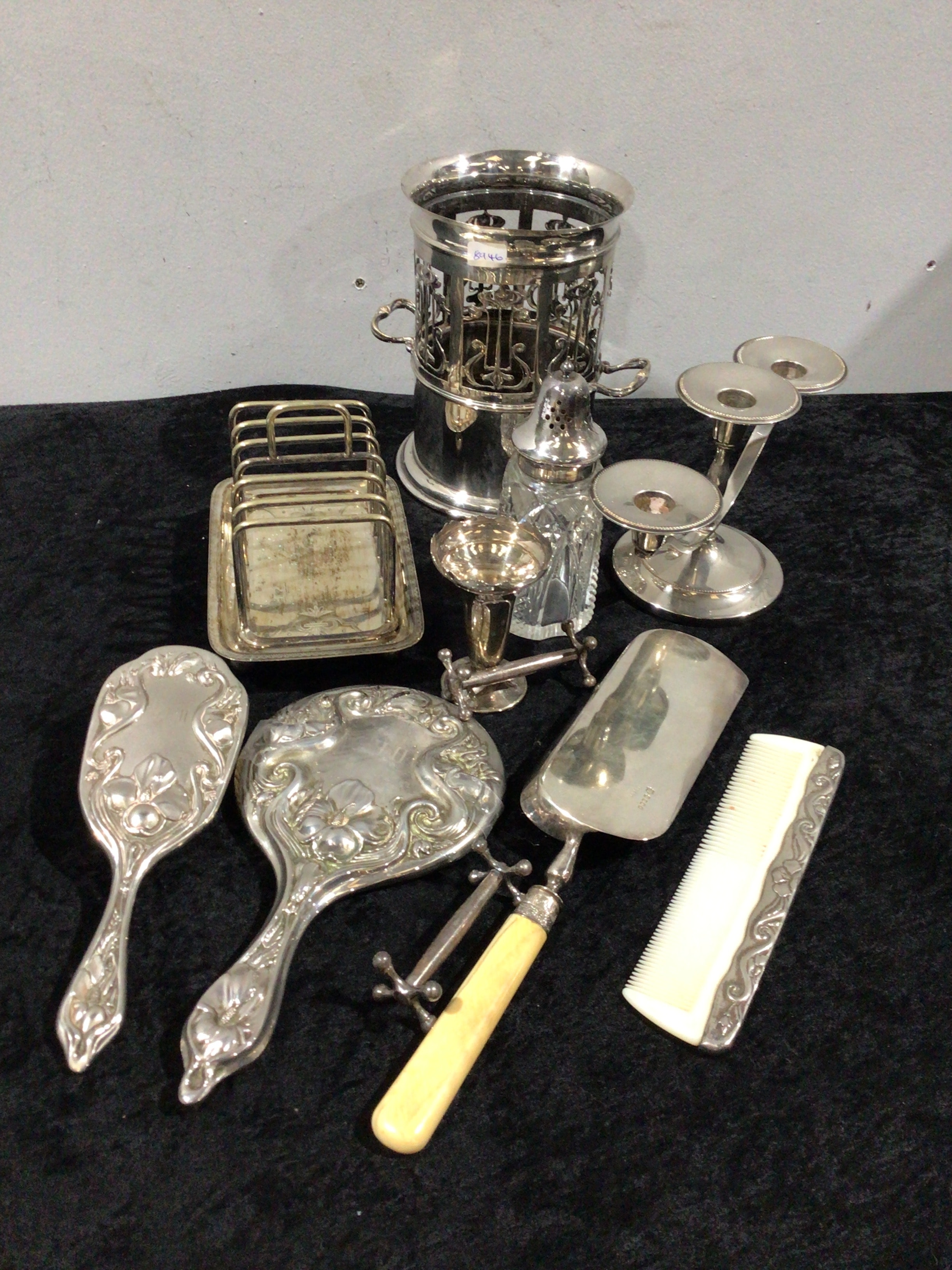The lot also includes assorted silver-toned tableware: a pierced cylindrical holder with handles (bearing inventory sticker “8446”), a three-branch candelabra or tiered candle holders with beaded rims, a five-slot toast rack with an integrated tray, a glass-bodied shaker with a metal top, and a small stemmed goblet. Completing the assortment is a cake or pie server with a pale yellow handle, likely bone or ivorine.pl