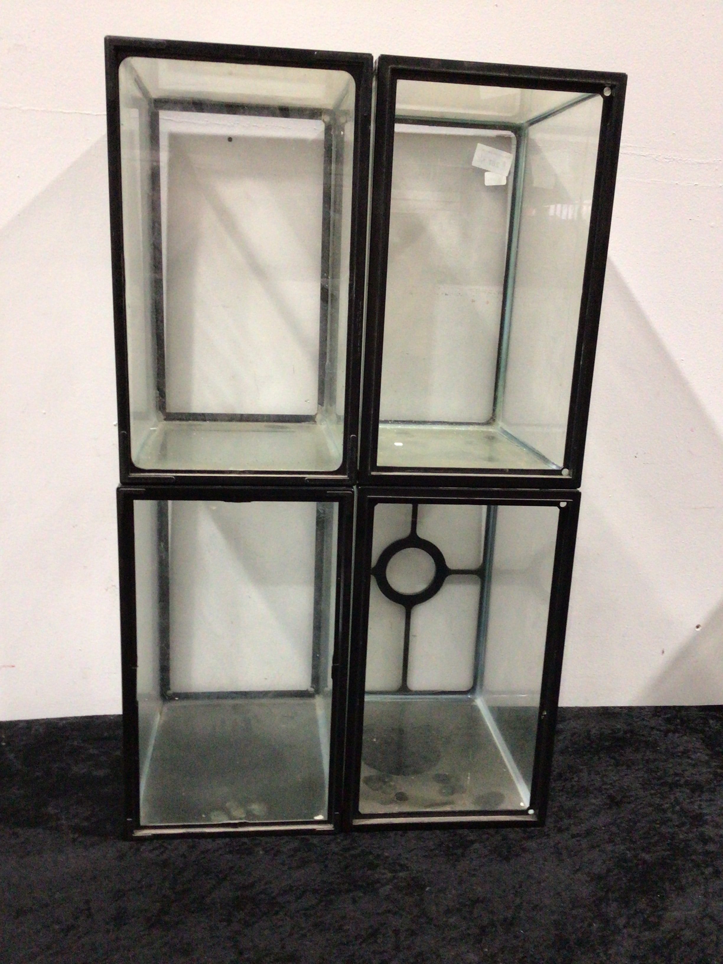 A set of four rectangular display containers, likely intended as terrariums or aquariums, constructed from clear glass panels joined by slim, black-colored framing, which appears to be either metal or a durable synthetic material. The units are presented in a 2×2 stacked arrangement. The bottom-right unit features a distinct decorative panel on its visible side, presenting a black-framed geometric design with a central circular motif. A blurry, unreadable white sticker is adhered to the interior back panel of the upper-right unit.