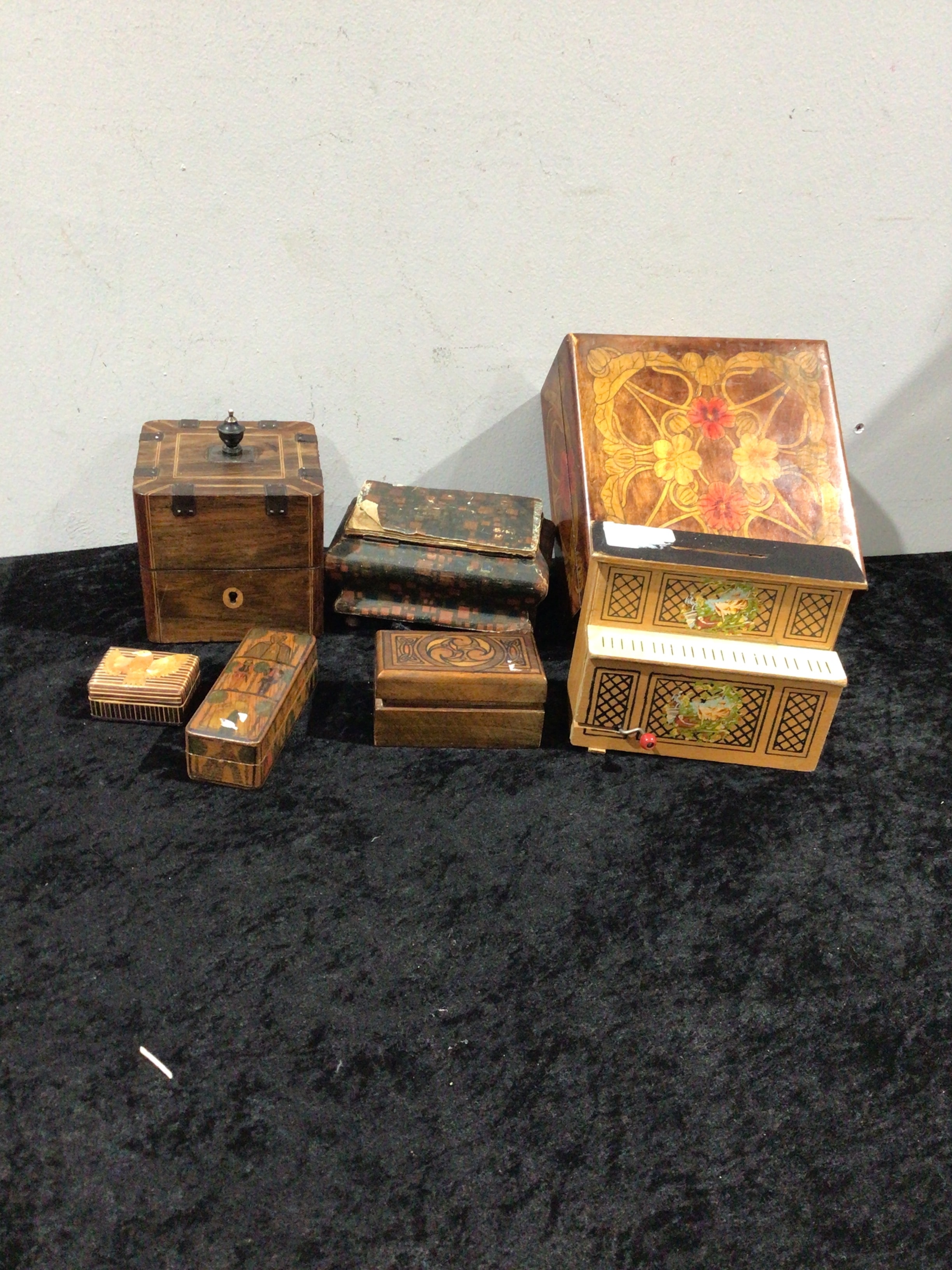 This lot comprises seven small decorative boxes and three heavily worn bound volumes. The boxes are predominantly crafted from wood, showcasing a variety of decorative techniques including marquetry or painted floral and foliate motifs on a large sloping lid box, geometric and striped inlays, and painted scenes featuring figures and landscapes on rectangular boxes. One box features a Celtic knot design, while another tall box has brass-toned metal corner straps, a central finial, and a keyhole. The three bound volumes appear to be small, old books with worn, possibly leather or paper covers, exhibiting a mottled pattern. No legible text or manufacturer’s marks are discernible.