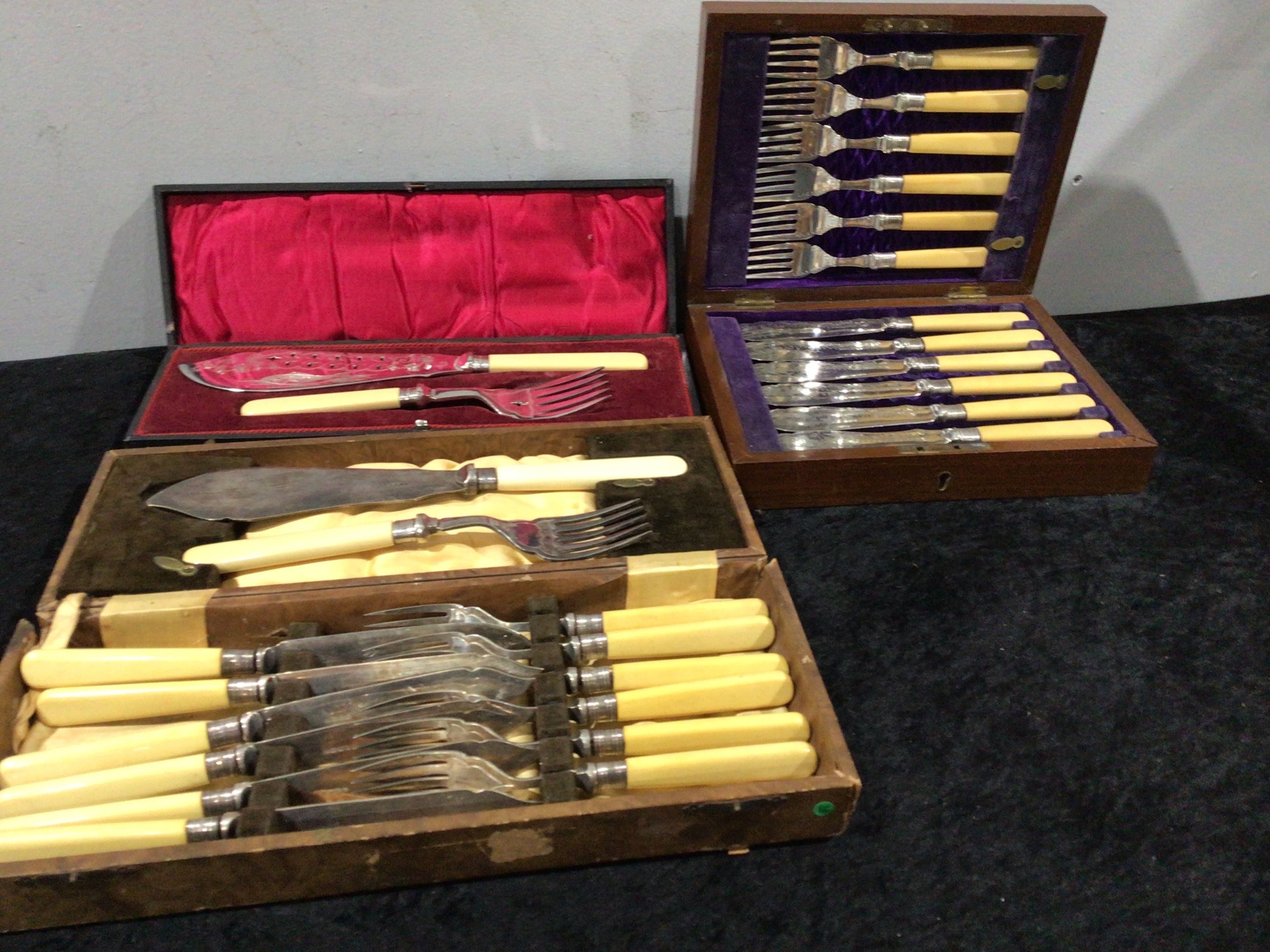 A collection of English EPNS (Electro-Plated Nickel Silver) fish knives and forks, dating to the 19th century. The lot comprises three open wooden presentation cases. The first case, lined with red velvet-like fabric, contains a large serving knife with an ornate, etched blade and a matching four-tine fork. The second, a darker wooden case with a purple velvet lining, holds six four-tine forks with silver-toned ferrules. A drawer within this case reveals six matching knives with silver-toned blades. The third, simpler wooden box features a yellow/cream fabric lining, holding multiple knives and forks. All cutlery pieces feature cream-colored handles, likely celluloid or a similar early plastic material, consistent with the period.