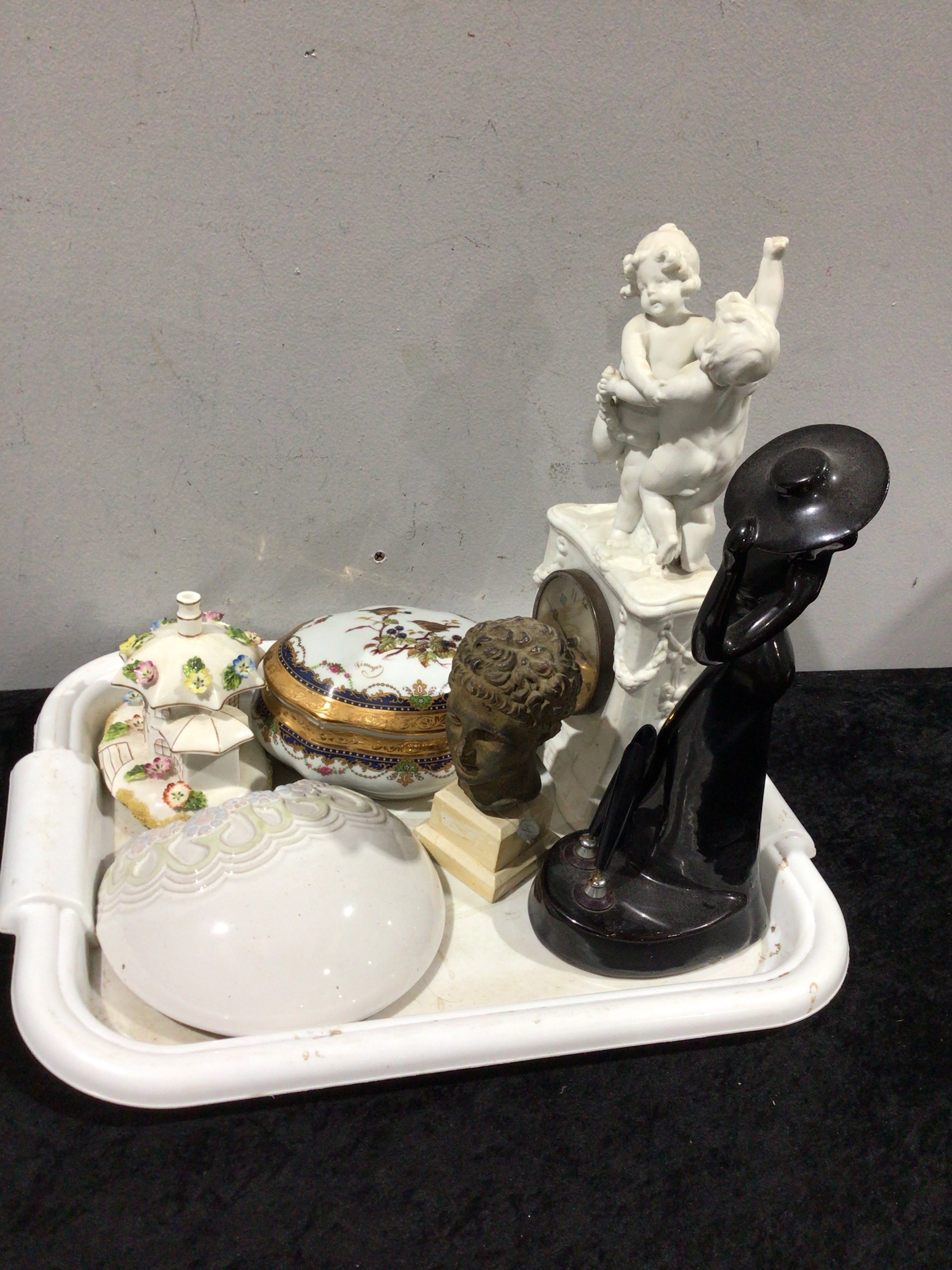 A collection of seven decorative objects, presented on a white plastic or ceramic tray. The group includes a white porcelain or ceramic oval-shaped trinket box with raised pastel decoration; a small white ceramic cottage-shaped item adorned with colorful floral appliques; and an ornate oval lidded box in white porcelain, decorated with extensive gilt scrollwork, blue borders, and multi-colored floral motifs. The underside of this lidded box bears faint, partially obscured text suggesting ‘Vienna’ or ‘Wiener’ and ‘Porcelain’. Also present is a patinated bronze or bronze-finished bust of a classical male head on a light-colored pedestal; a white bisque porcelain figural group featuring two putti on a neoclassical base, with a small clock face displaying Roman numerals partially visible behind them; and a glossy black stylized female figurine, possibly holding a hat or parasol.