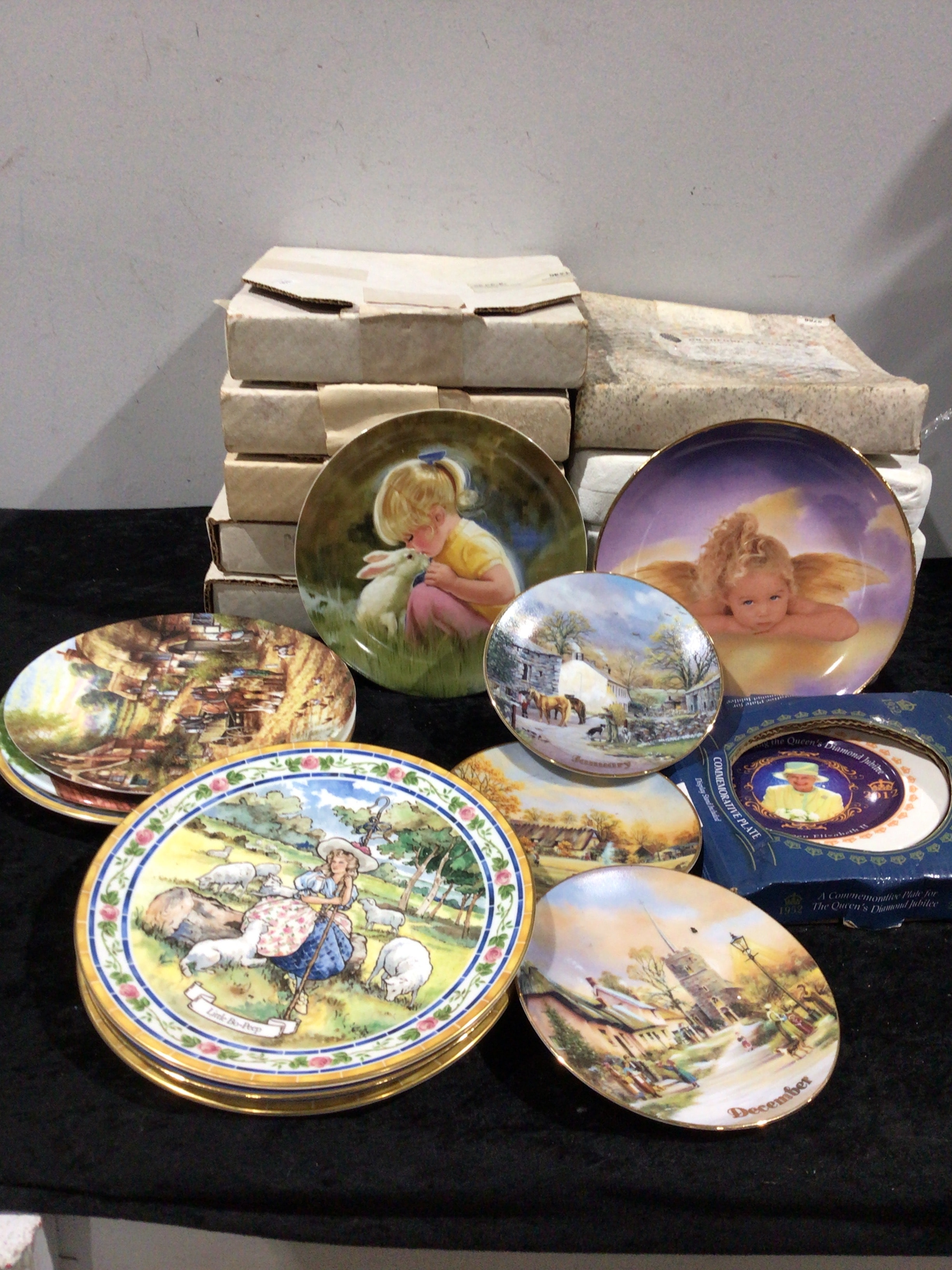 A collection of approximately ten ceramic and porcelain collector’s plates, primarily featuring works by Sandra Kuck and Thomas Kinkade. The collection includes plates depicting a young blonde girl embracing a white rabbit, and a cherubic angel against a purple sky, consistent with the style of Sandra Kuck. Also present are several smaller plates featuring picturesque pastoral and village landscapes, with visible inscriptions such as “Little Bo-Peep” and “December,” which align with the artistic themes of Thomas Kinkade. The lot also comprises a distinctive blue-boxed “COMMEMORATIVE PLATE” celebrating “The Queen’s Diamond Jubilee” in “2012,” featuring “H.M. QUEEN ELIZABETH II” and the date “1952.” Several plates are accompanied by their original cardboard packaging.