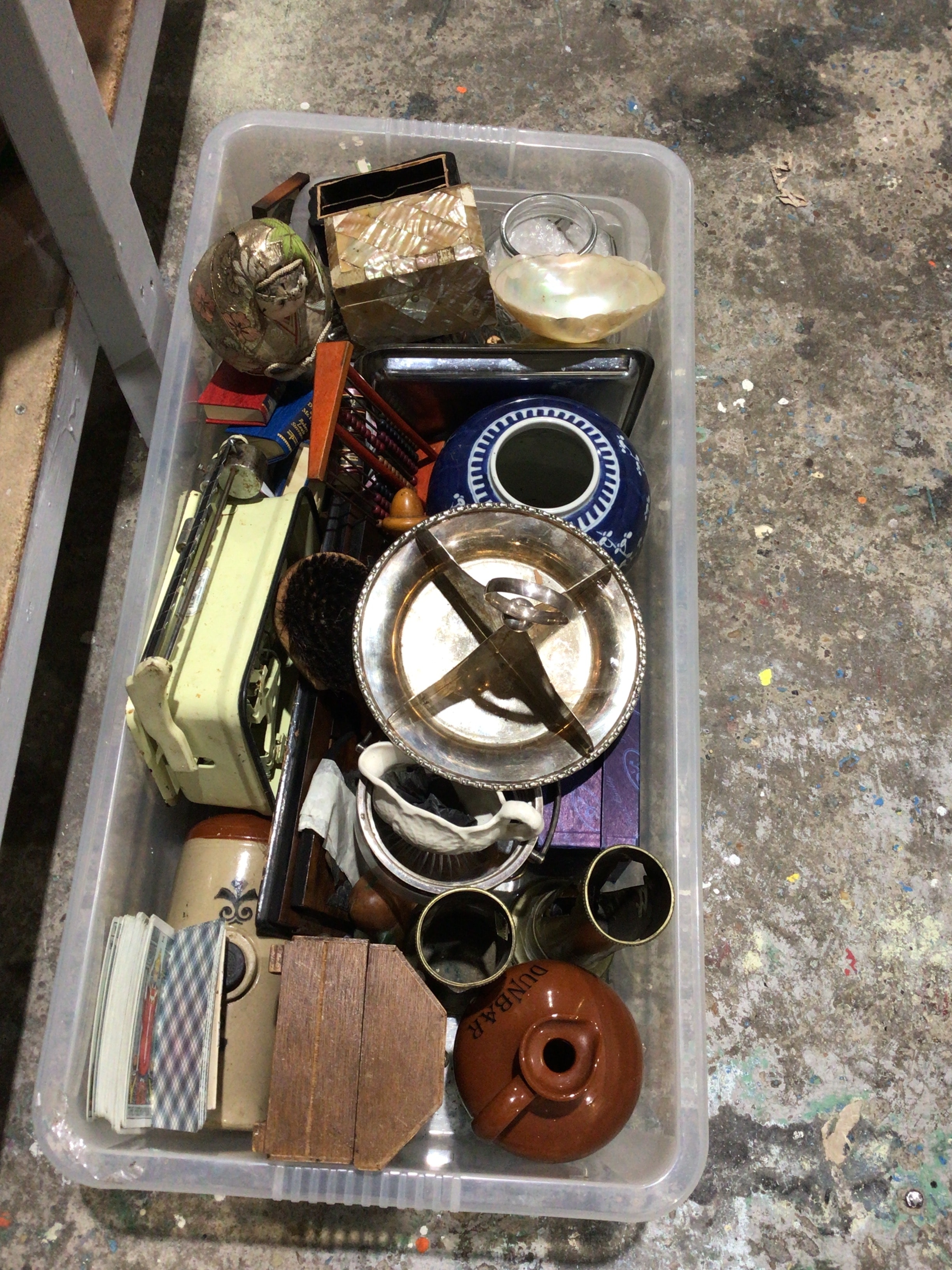 A varied assortment of decorative and utilitarian objects housed within a transparent plastic bin. Noteworthy items include a mother-of-pearl tessellated box, a cream-colored vintage metal kitchen scale, a blue ceramic jar with white geometric and floral patterns, and a tarnished silver-plated four-compartment serving dish. Also present are various ceramic pieces, notably a brown stoneware jug clearly marked “DUNBAR” and a stoneware crock featuring a blue stylized floral design, along with a white ceramic creamer. Additional contents comprise a gilded decorative sphere, a large iridescent shell, a clear glass jar, a stack of playing cards, two small bound books (one blue with partial text “Dr. Robert L… Street…”), and two brass-toned metal cups. The collection exhibits mixed materials, primarily ceramic, various metals, shell, glass, wood, and paper.
