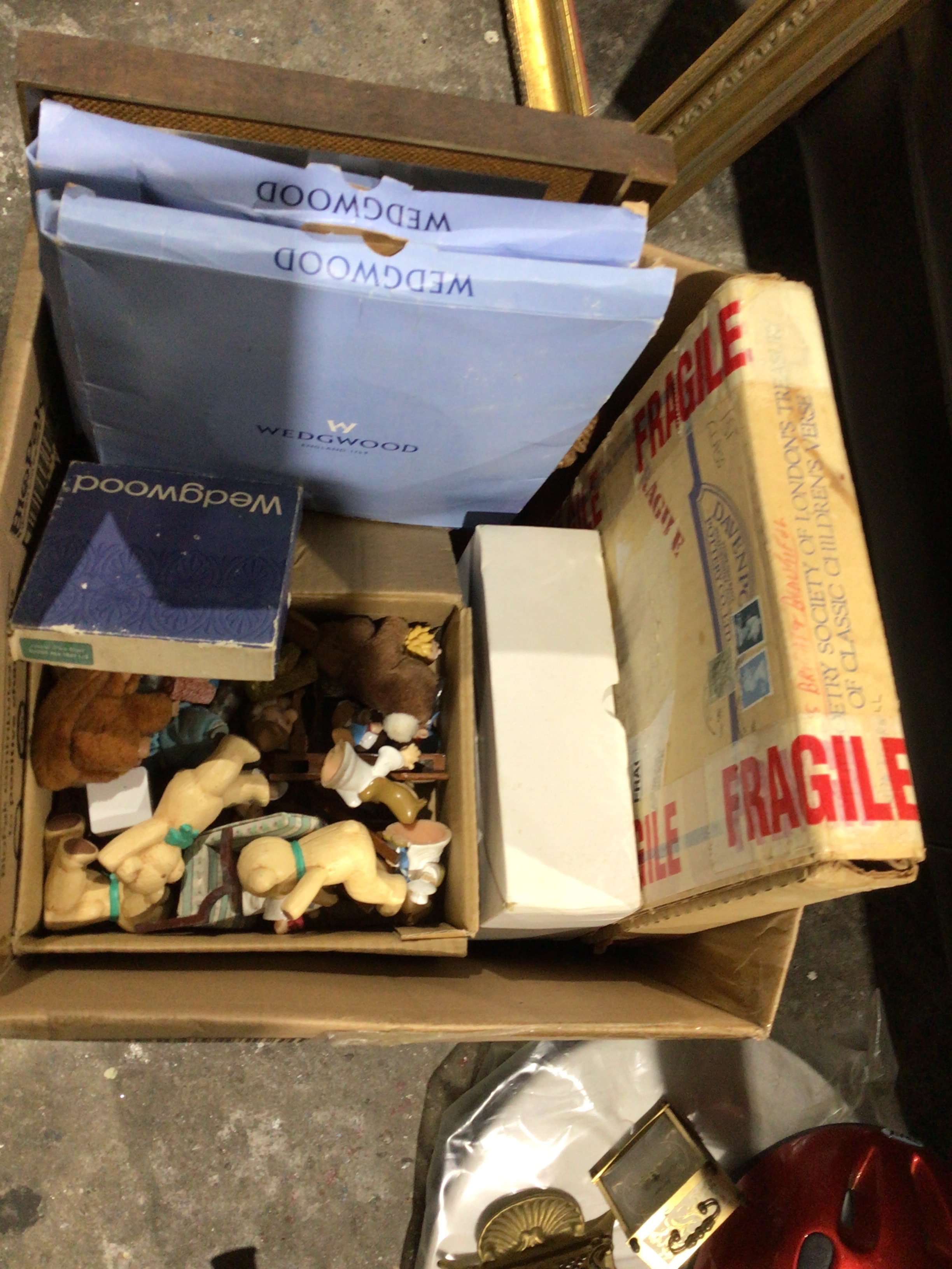 This lot comprises an open cardboard box containing a diverse assortment of items. The primary identifiable collection is a Boyds Bears Nativity Set, consisting of several loose, light-toned figurines, likely ceramic or resin, depicting children-like figures, accompanied by a small plush animal, all housed within a smaller, open internal box. Also present are multiple light blue packages and a smaller box, all marked with the brand ‘WEDGWOOD’. A worn, tan cardboard box is included, featuring ‘FRAGILE’ in red tape and additional English text reading ‘SOCIETY OF LONDON’S TREASURE’ and ‘CLASSIC CHILDREN’S VERSE’, suggesting literary collectibles. A plain white box is also within the main container. Adjacent to the main box, a gilded wooden frame piece is observed.
