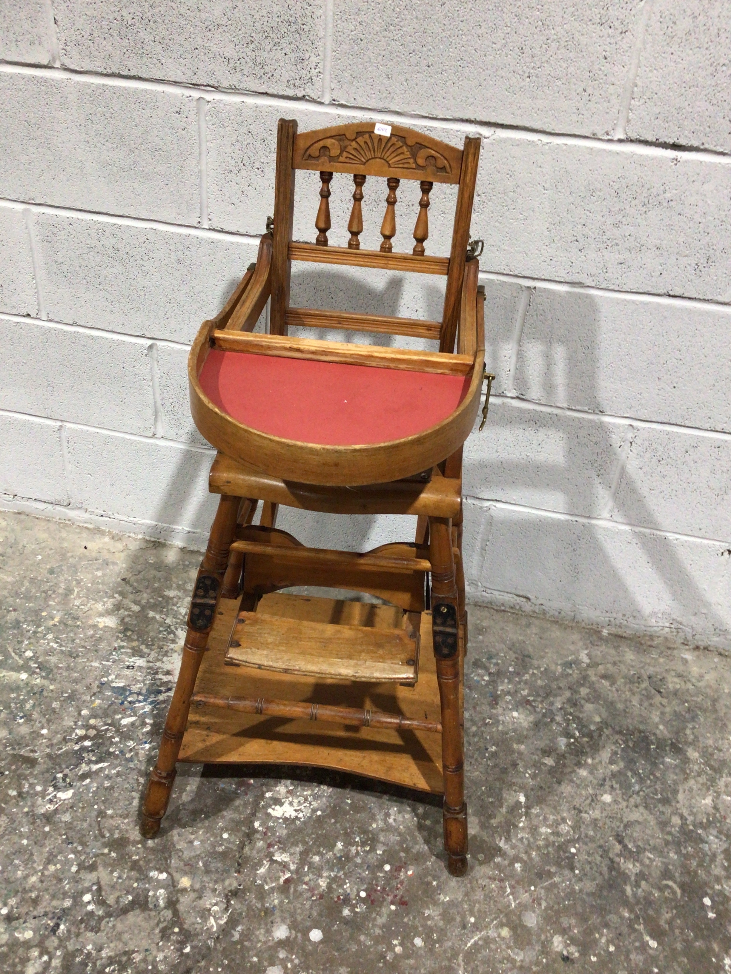 An 1950’s oak combination high chair, dating from the late 19th or early 20th century. Constructed primarily of medium-toned oak, it features a carved backrest with a central sunburst or fan motif and turned spindles, legs, and stretchers. The chair incorporates metal hinges and latches on the sides, allowing for its convertible function. A removable or adjustable tray is present, lined with a red fabric. A white sticker with the number ‘6183’ is affixed to the top rail of the backrest.