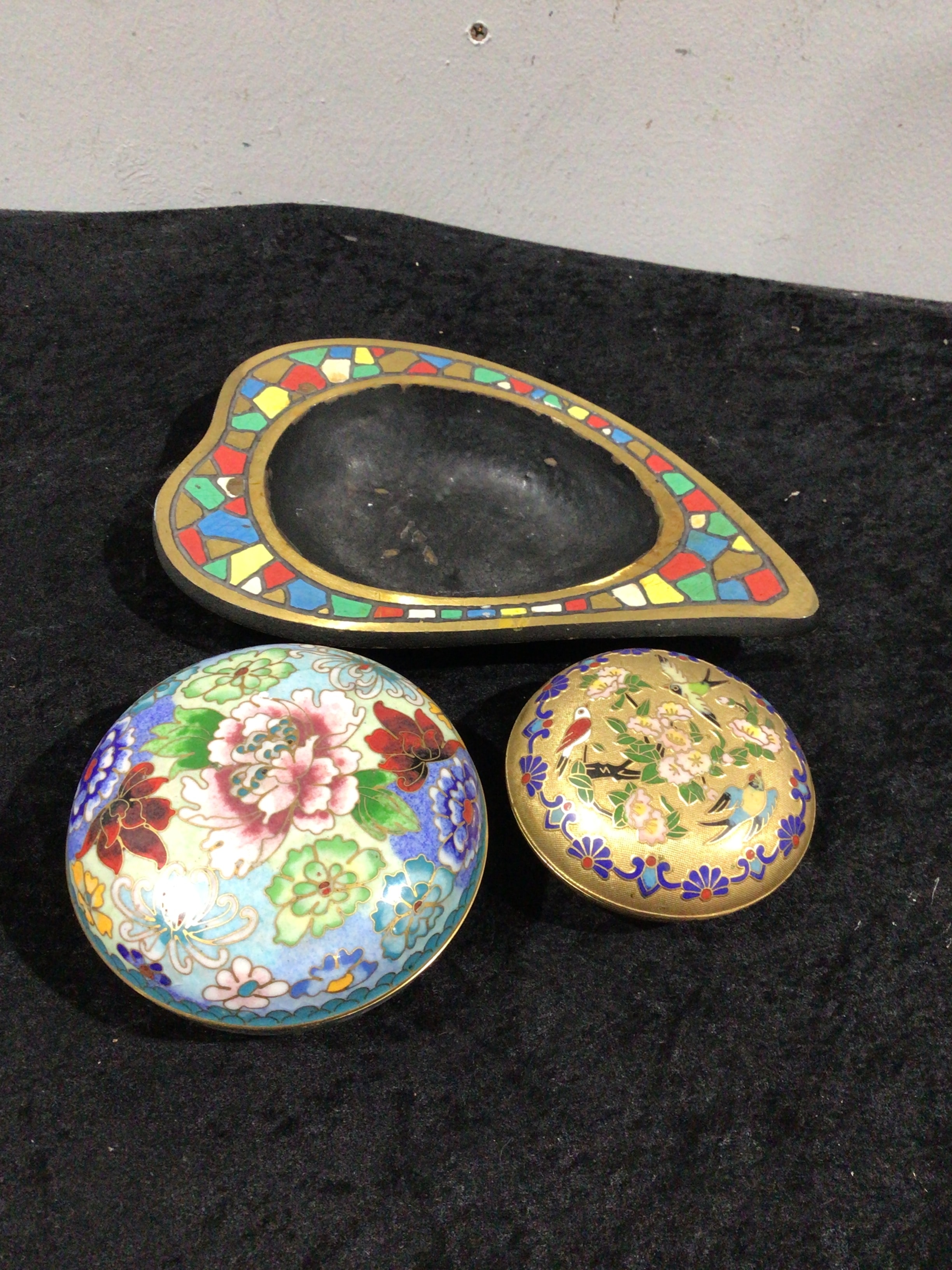 This lot comprises three decorative objects. The kidney-shaped shallow tray is a Mid-Century Modern solid brass enameled dish, attributed to Dayagi, Israel, circa 1960s. It features a gilded rim embellished with a mosaic-like pattern of multi-colored enamel or glass segments, surrounding a dark-toned metal interior. The lot also includes two lidded circular boxes executed in cloisonné enamel on a metal base, featuring intricate East Asian-style motifs. The larger box displays prominent peony blossoms on a light blue ground, while the smaller showcases birds amidst flowers and foliage on a gilded background. Both cloisonné boxes utilize a vibrant palette of pink, red, blue, green, and white enamels. No discernible text or markings are visible on any of the items.