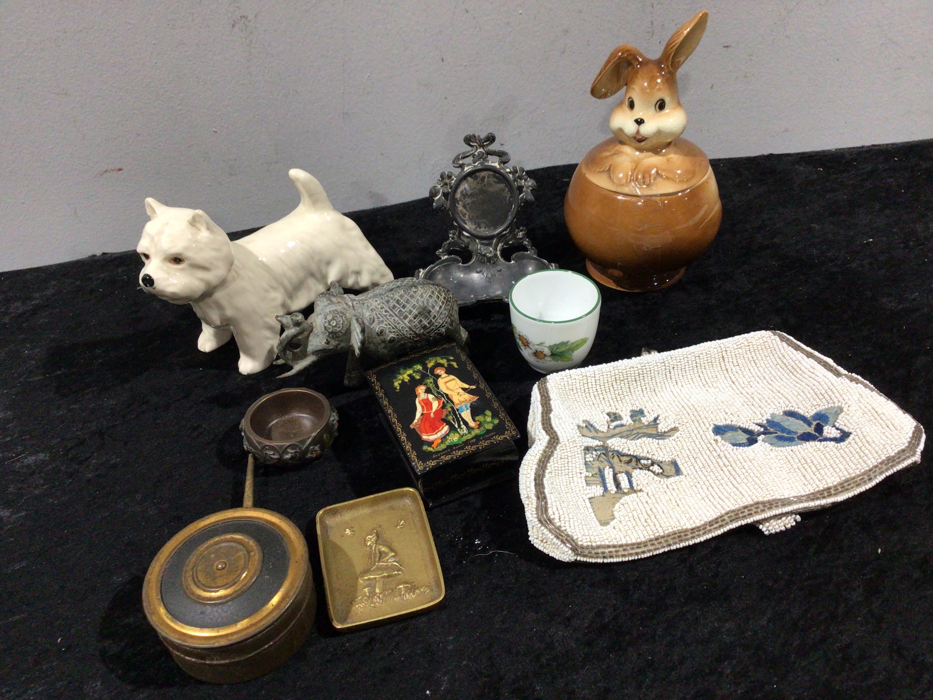 A diverse collection of decorative and functional objects. Comprising a white glazed ceramic West Highland Terrier-style figurine; a heavily textured grey metal elephant figurine; a small ornate dark metal frame with an oval mirror; a brown and cream glazed ceramic bunny rabbit lidded jar; a small bronze-tone metal decorative bowl; a brass cylindrical container with a dark inset lid; a square brass tray embossed with a figure on a mushroom; a white porcelain cup with a green rim and hand-painted daisy motif; a white micro-beaded evening bag featuring blue floral beadwork; and a black lacquer box with a hand-painted scene depicting two figures under a tree, bearing the Cyrillic inscription “Лукоморье 2005” (Lukomorye 2005), suggesting a Russian origin and a production year of 2005.
