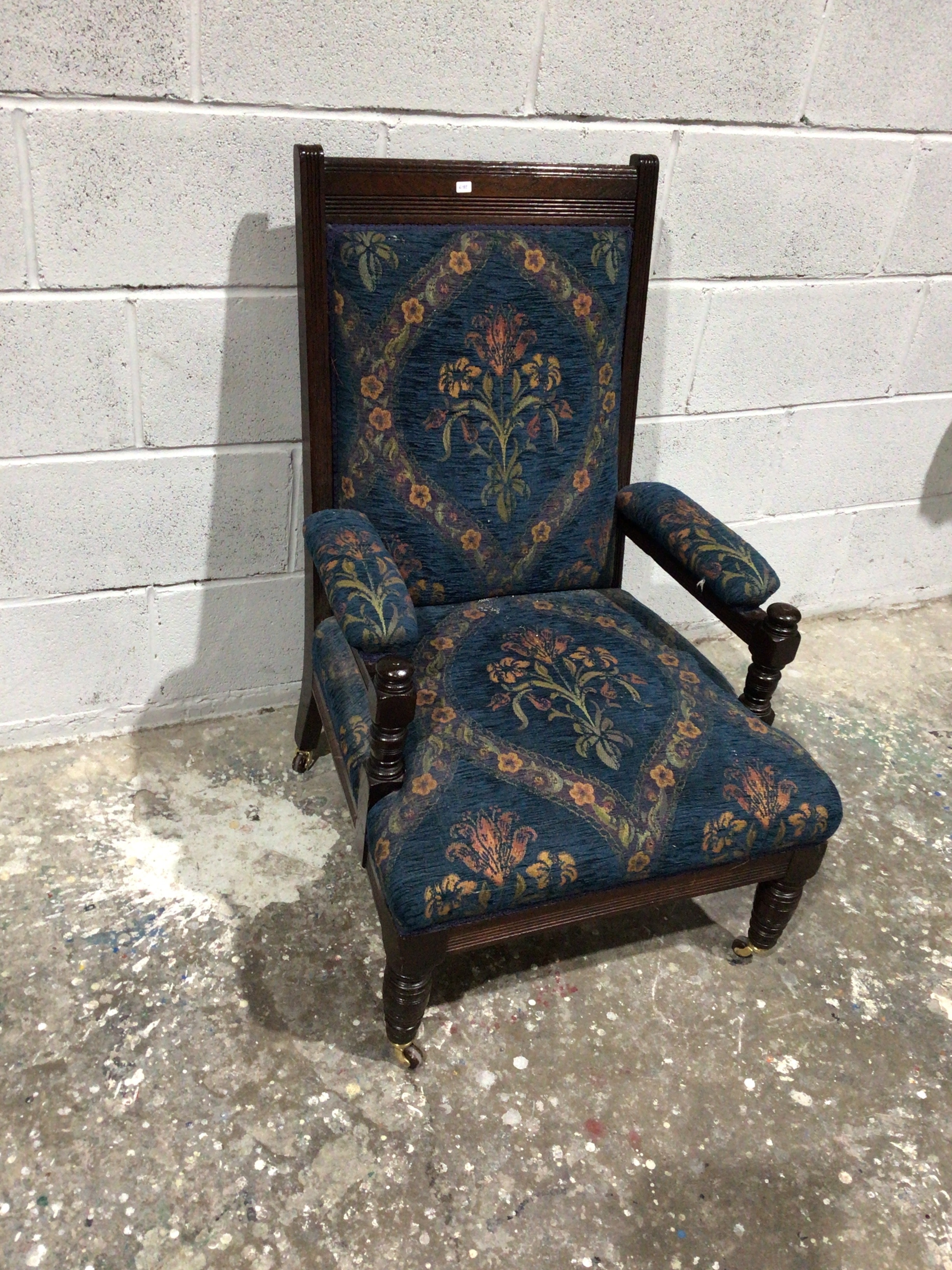 A late 19th/early 20th century carved oak armchair, featuring a dark stained wooden frame with a high back and upholstered armrests. The chair is clad in a patterned blue-green fabric with an ornate floral and foliate design in shades of orange, gold, and green. The wooden frame exhibits turned legs, terminating in brass and porcelain/wood casters on the front. A small white label, bearing the inscription ‘CAT 14’ or ‘CST 14’, is affixed to the top rail of the backrest.