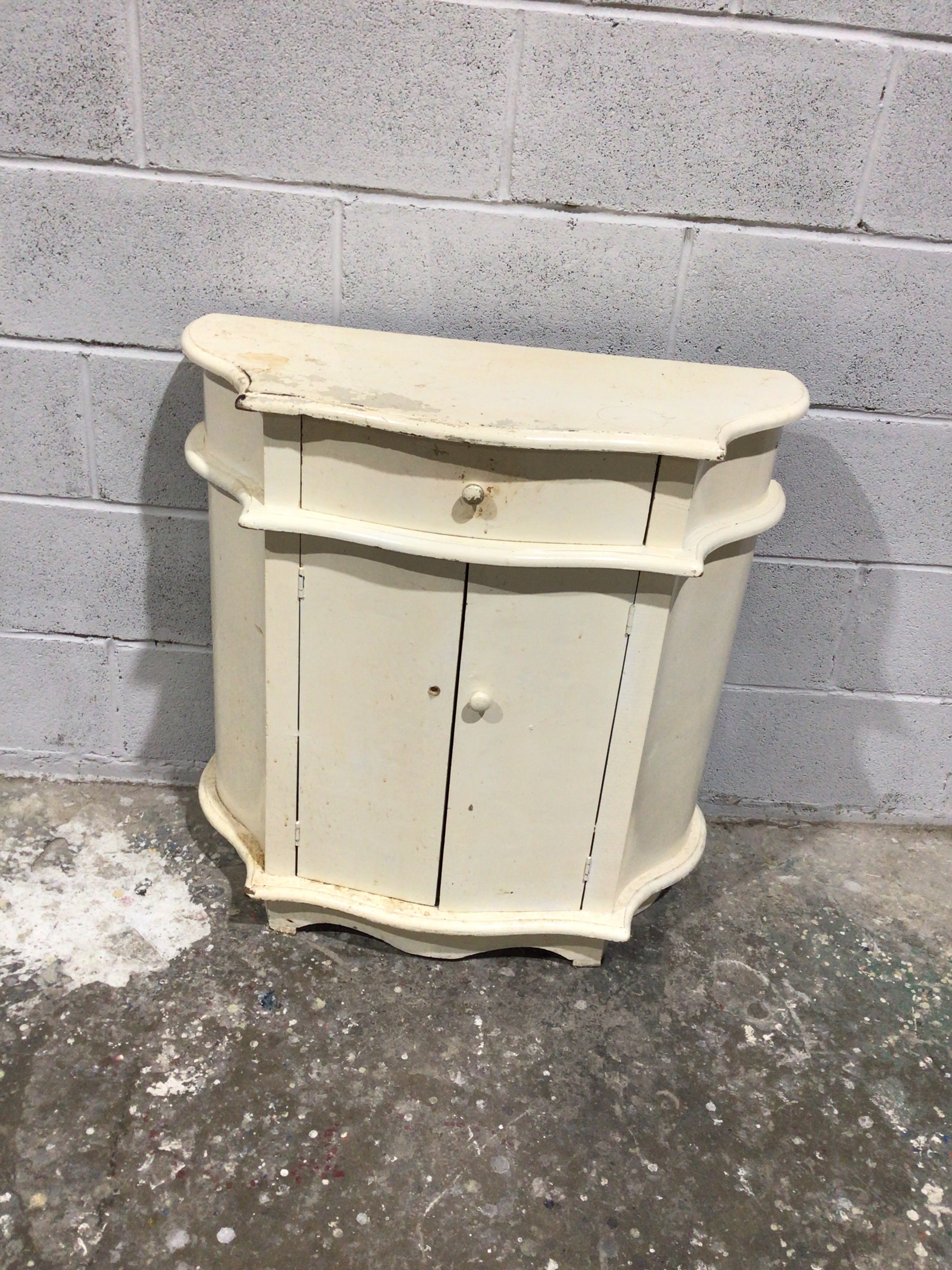 A Rococo-inspired side cabinet, constructed from wood, featuring a serpentine front, curved sides, and a shaped apron with short, curved feet. The cabinet is fitted with a single central drawer positioned above two hinged cabinet doors. The entire piece is finished in a cream or off-white paint, with cream-painted wooden knobs, though the knob for the left door is missing.