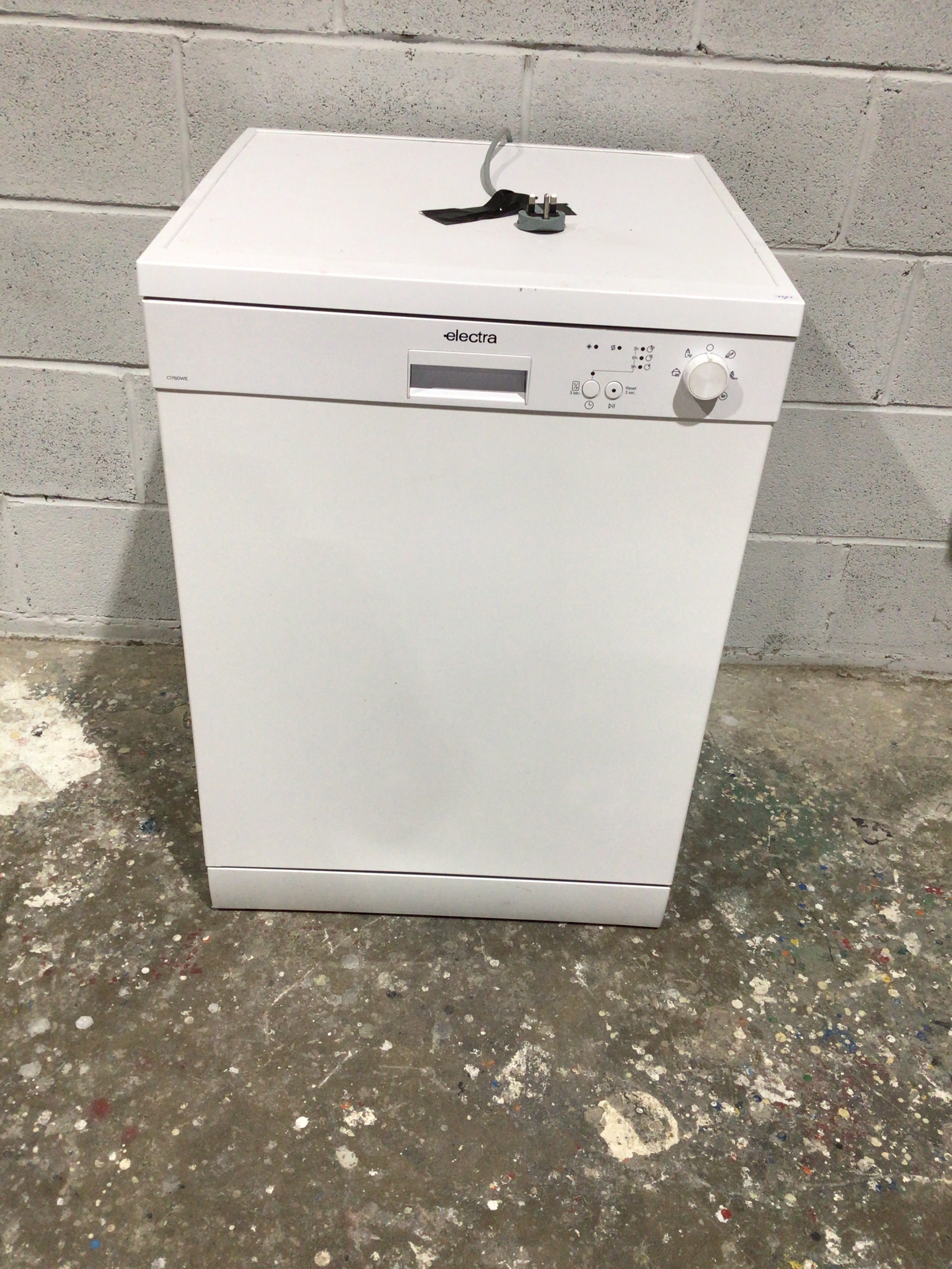 An Electra CTP86WOS freestanding dishwasher. The appliance features a contemporary white design with a central digital display, push buttons for functions such as half-load and delay start, and a rotary dial for program selection, including eco, intensive, and rapid wash settings. The interior reveals a stainless steel base, two white wire racks for dishes, and packaged accessories including a hose and cutlery basket. A UK-style three-pin power plug is present.