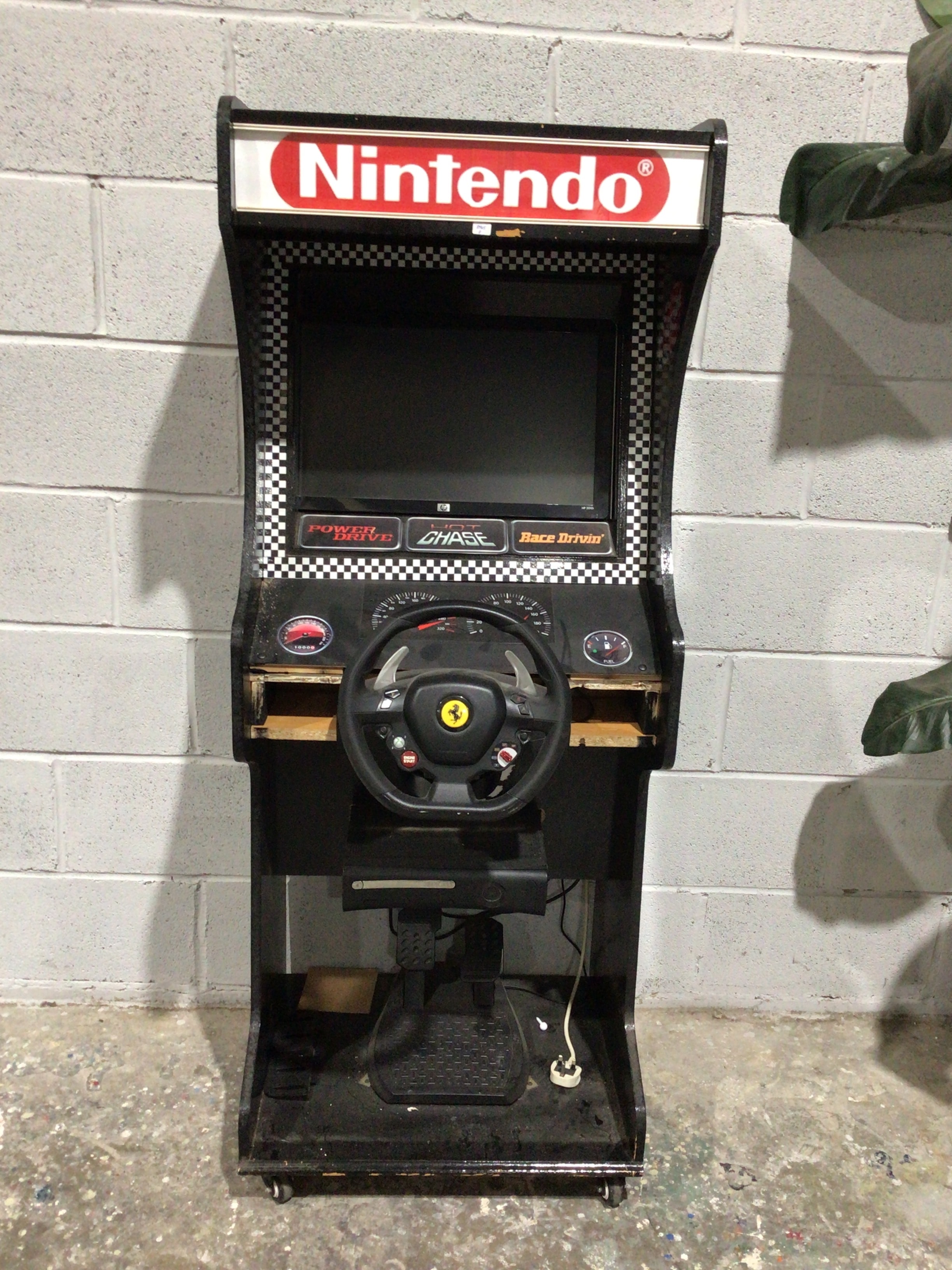 A custom-built or heavily modified Arcade1Up style racing arcade cabinet, constructed primarily from wood or MDF with plastic and metal gaming components. The top marquee prominently displays a ‘Nintendo’ logo in red. The area below the monitor features ‘POWERED by,’ ‘CHASE,’ and ‘Race Drivin” text, alongside a checkerboard pattern surrounding an HP flat-screen monitor. Integrated controls include a steering wheel bearing a ‘Ferrari’ logo and a ‘Thrustmaster’ brand mark, paired with a pedal unit at the base. Internally, the cabinet houses an Xbox 360 console and its associated power supply unit.