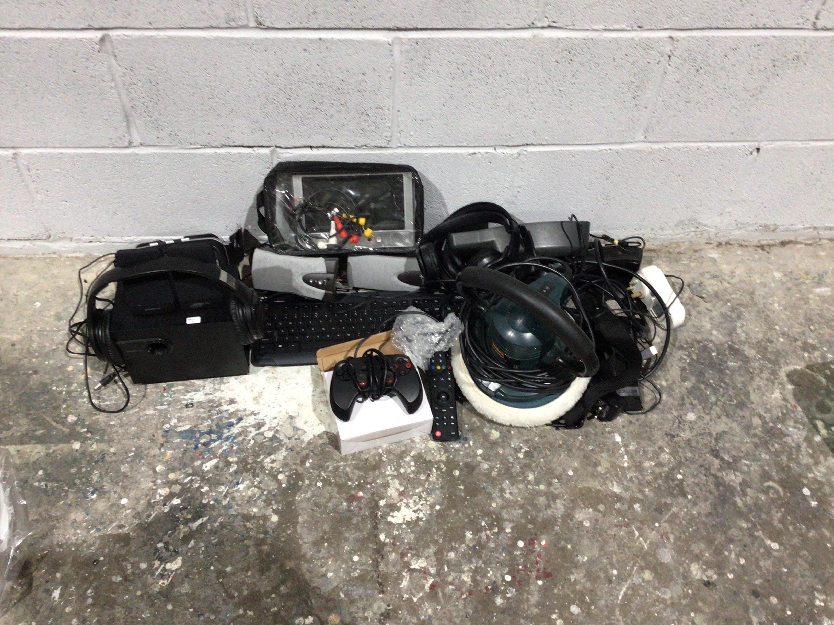 A varied collection of contemporary electronic accessories and a single power tool, primarily constructed from plastic and metal. The lot includes a portable screen or monitor housed in a black soft case, a pair of grey and black computer speakers, a black computer keyboard, a pair of black over-ear headphones, a black wired gaming controller with red joystick accents, and a black remote control. Also present is a dark green orbital polisher or sander, clearly marked “BOSCH” on its side, with a white polishing pad and coiled power cord. The collection further comprises numerous tangled cables, various power adapters, and a white multi-socket extension lead branded “MASTERPLUG.”