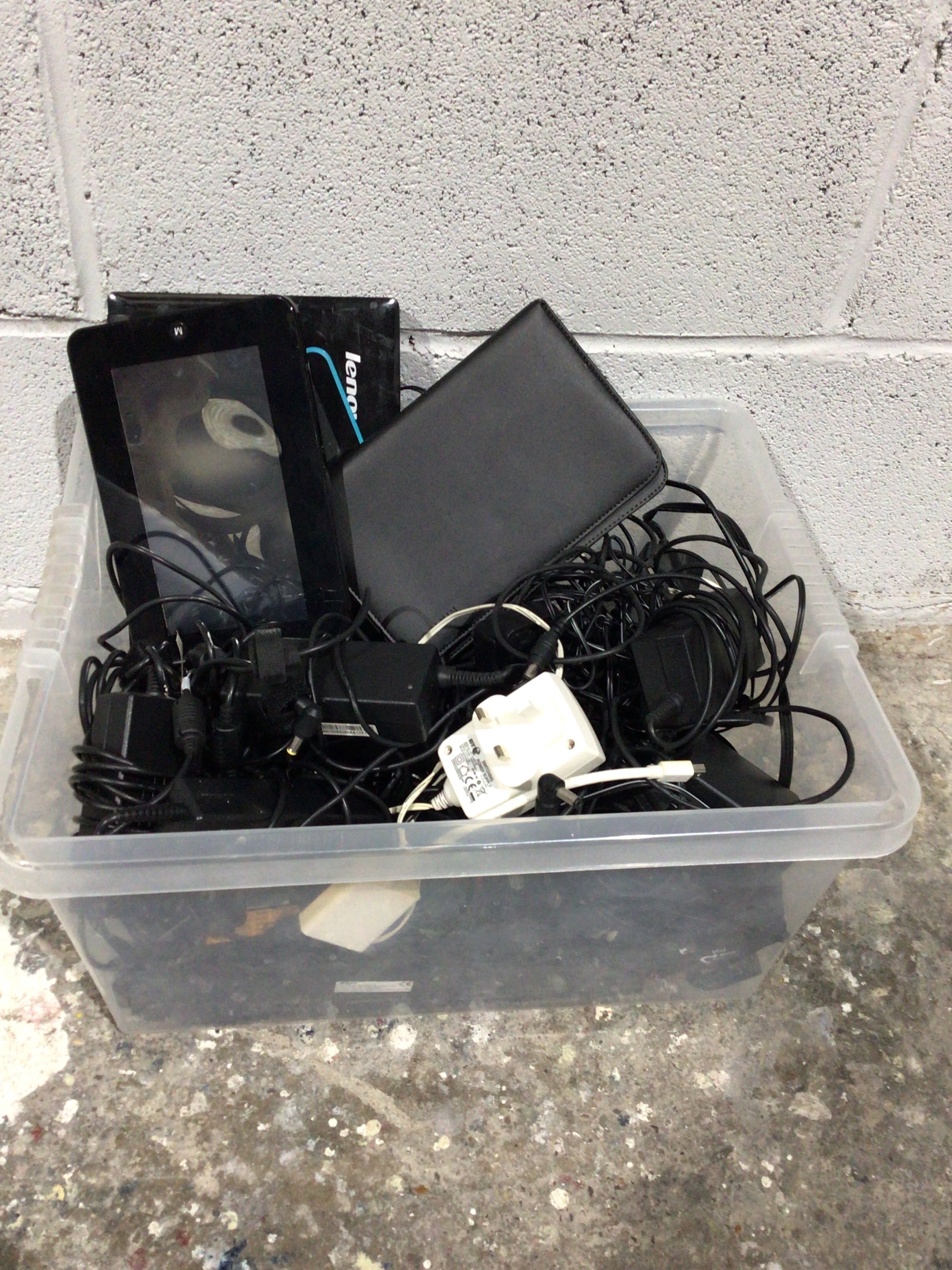 This lot comprises a collection of contemporary consumer electronics and associated accessories, presented within a clear plastic rectangular storage bin. The primary items include two tablet-style devices, one of which displays “Lenovo” branding. The second tablet features a dark cover and a ‘W’-like symbol visible on its smudged screen. The bin is largely filled with a dense tangle of black electronic cables, power adapters, and chargers. A white three-pin UK power plug is visible, marked with “BT” and international regulatory symbols including “CE”.