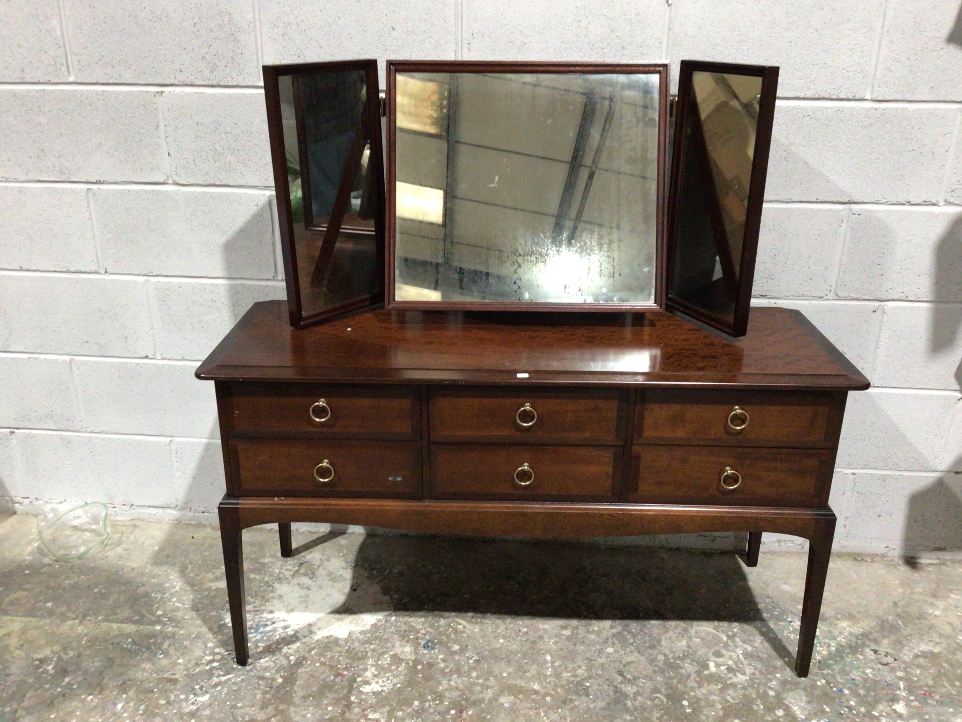 A Stag Minstrel Mid-Century Modern dressing table, constructed from what appears to be mahogany or walnut veneer. The piece features a rectangular top and six drawers, each adorned with brass-toned ring pull hardware. It is supported by tapered legs and is surmounted by a detachable tri-fold mirror assembly, comprising three rectangular wood-framed panels. The overall style is consistent with Mid-Century Modern design.
