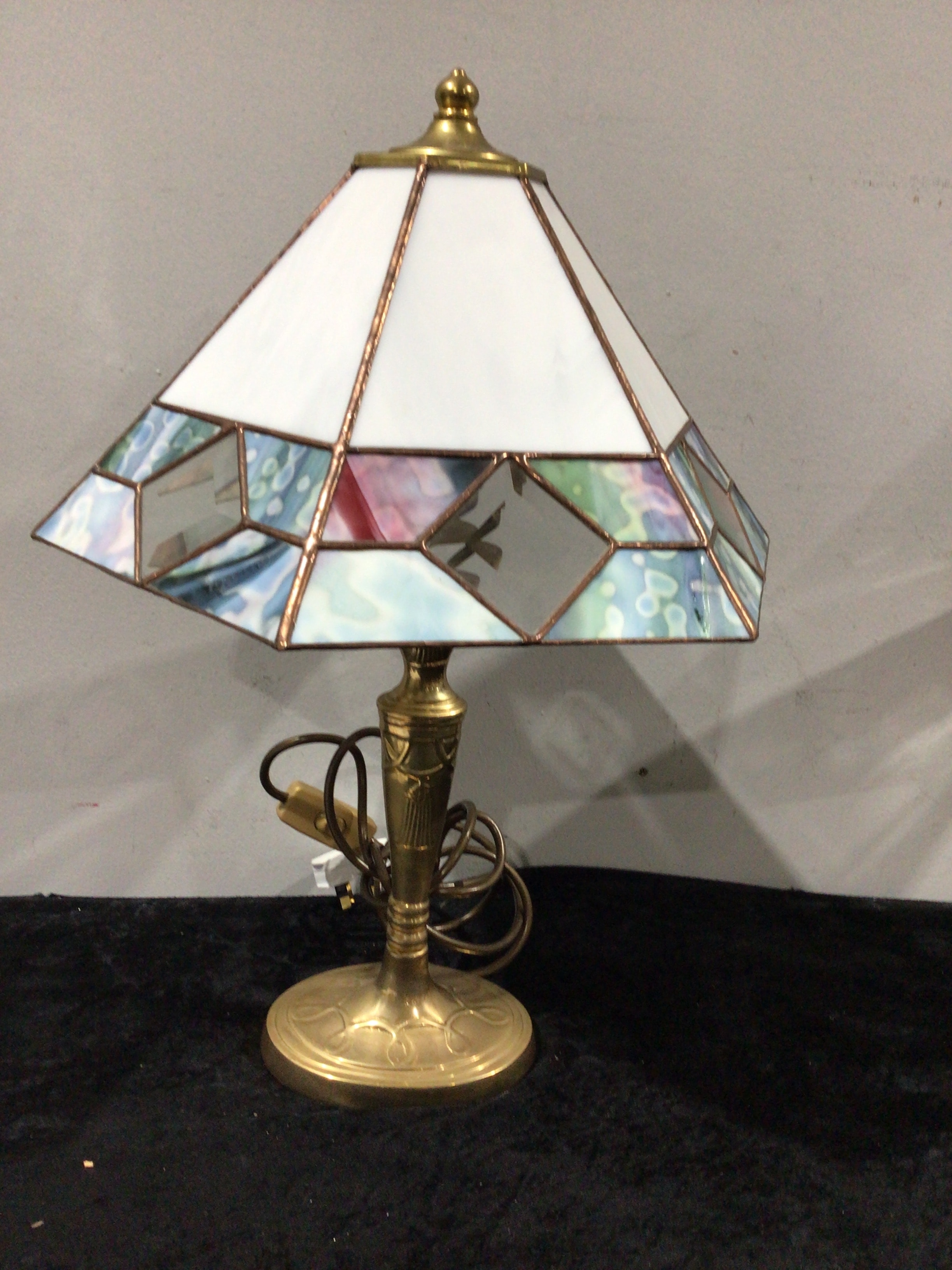 The Tiffany style table lamp features an octagonal stained glass shade composed of clear, opaque white, and various translucent multicolored geometric panels, joined by lead or copper foil, set atop a fluted brass-tone metal column and a circular, decorative base.