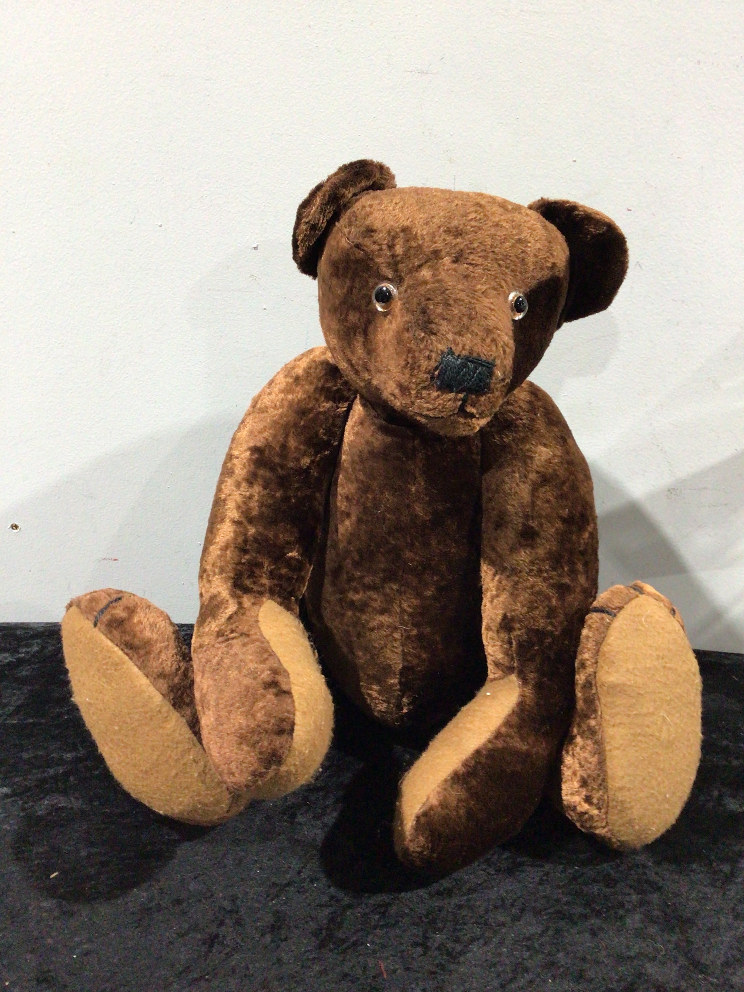 A traditional-style teddy bear, constructed from a rich brown plush fabric that exhibits a somewhat matted texture, suggestive of mohair or a similar period material. It features dark, reflective button eyes, a stitched black nose, and a simple downward-curved mouth. The bear’s paw pads are fashioned from a lighter tan, smoother felt-like material. The item appears to have jointed limbs, currently presented in a seated pose.