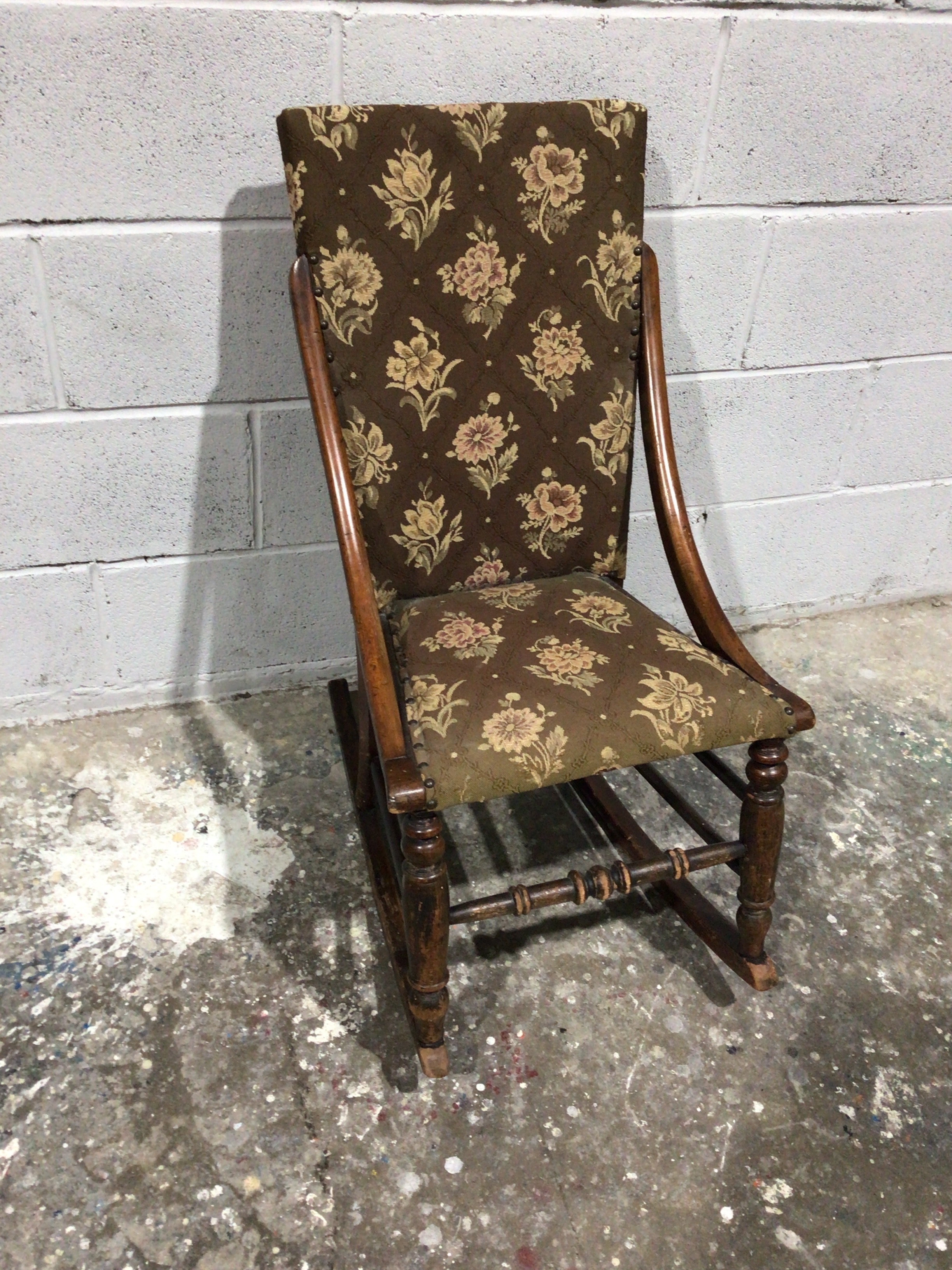 A 19th Century Eclectic Platform Rocker with Springs. This upholstered wooden rocking chair features a dark-stained hardwood frame with turned front legs and stretchers, and gracefully curved arm supports. The back and seat are upholstered in a brown textile with a repeating floral pattern in shades of gold, cream, and muted rose, secured by visible metal tacks along the edges.