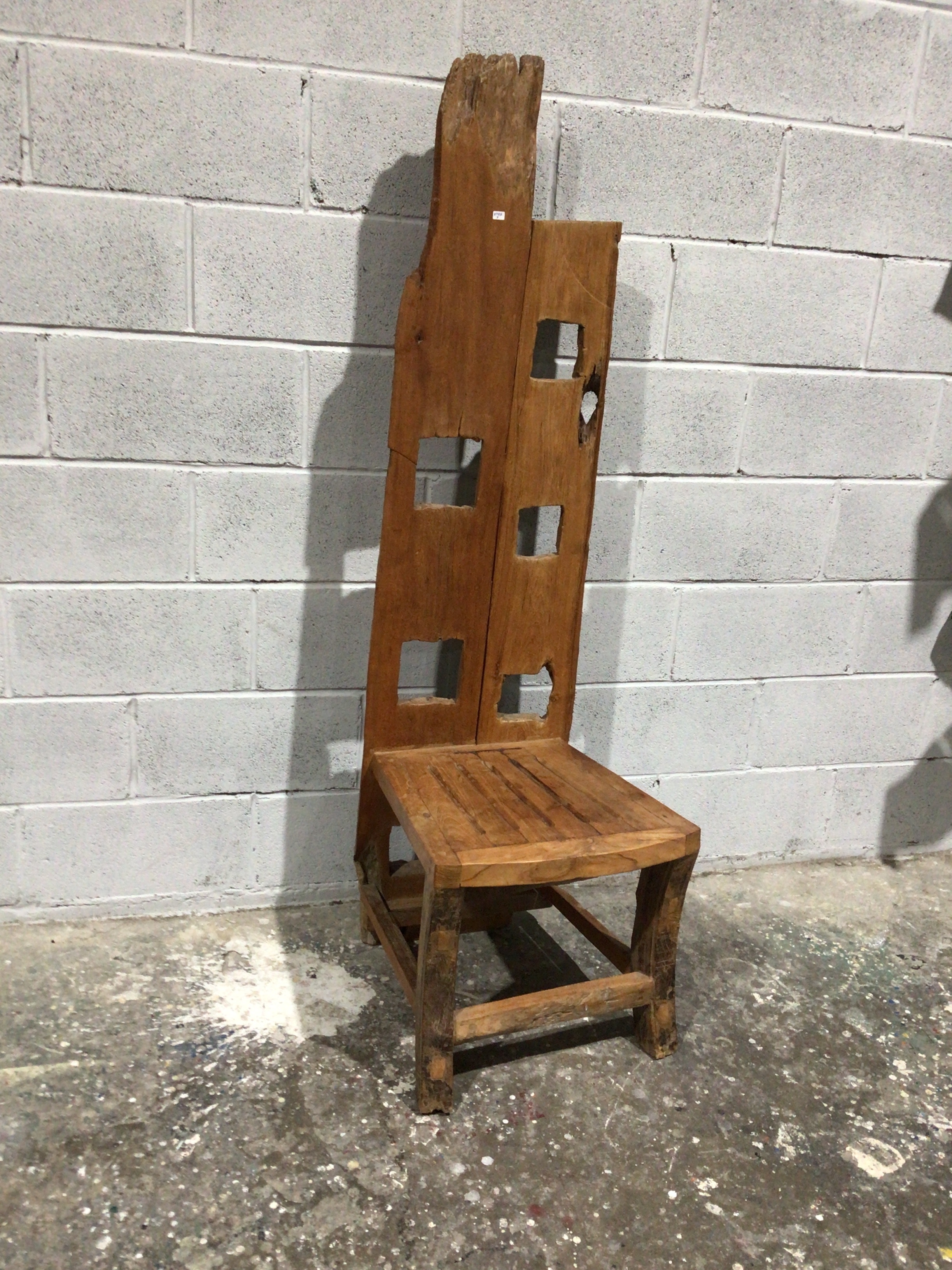A Mid-Century sculptural French chair, crafted from olive wood and walnut, dating to the 1940s. This tall, rustic wooden chair is constructed from robust, medium-toned hardwood. It features a high, two-panel backrest, with the left panel exhibiting a natural live edge at the top. Both backrest panels incorporate multiple square and an irregular cut-out. The seat is formed from several horizontal planks. A small white sticker with black text reading “ITEM 973B” is affixed to the upper backrest. The chair’s aesthetic is characterized by its raw, rough-hewn quality, with visible wood grain and natural imperfections.