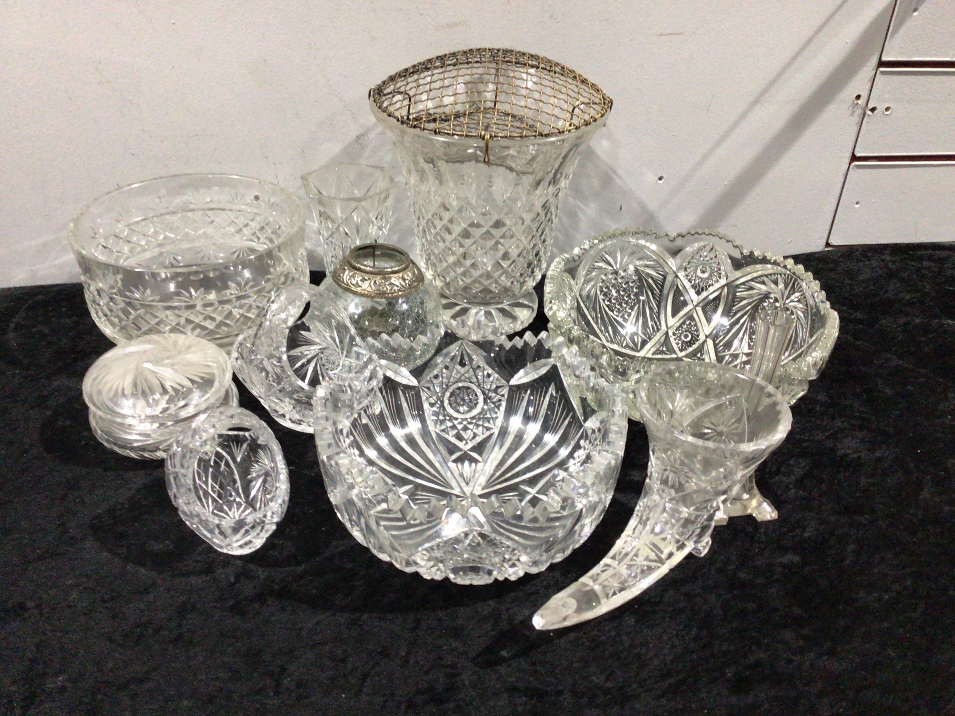 This lot comprises ten clear glass and/or lead crystal decorative items, predominantly showcasing intricate cut glass patterns including diamond, starburst, hobnail, and fan motifs. The collection features various bowls, a footed vase equipped with a removable brass-toned wire floral frog, a small lidded trinket box, a hexagonal tumbler, a decorative boot-shaped ornament, and a small spherical bottle with an ornate silver-toned metal collar and a possibly crackled texture. While specific periods are not marked, the designs reflect styles common from the late 19th through the 20th centuries.